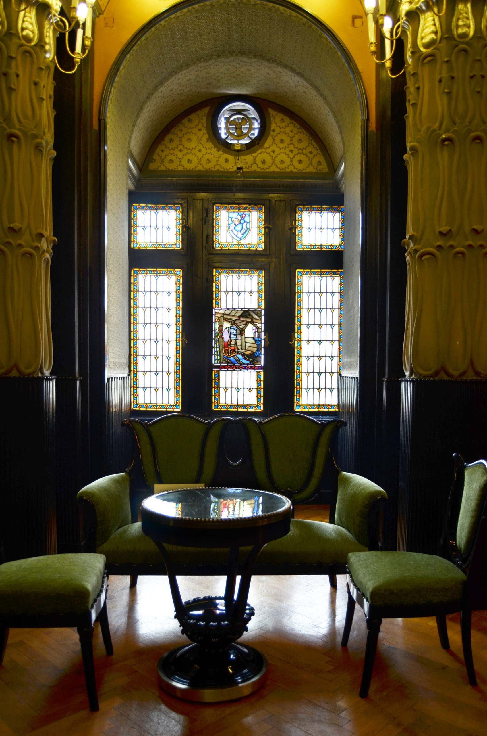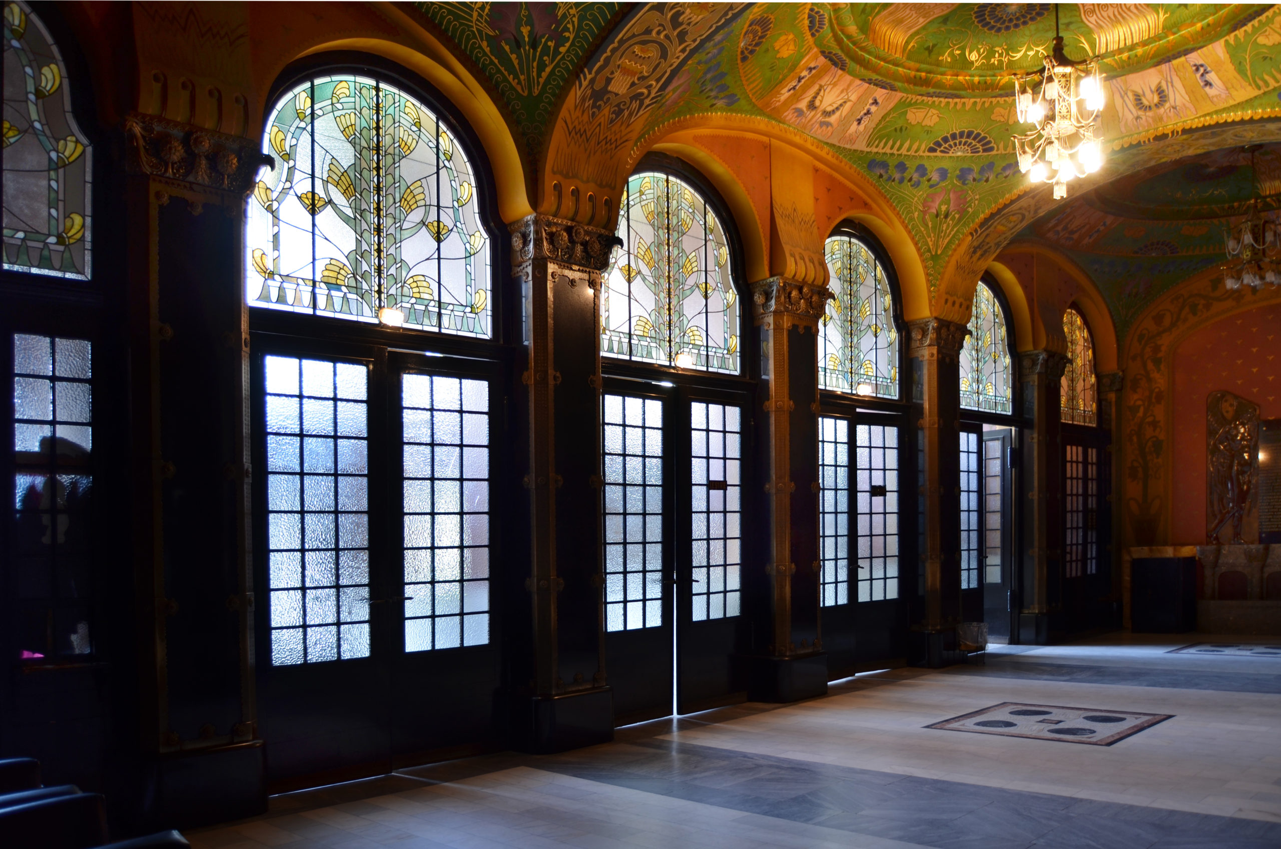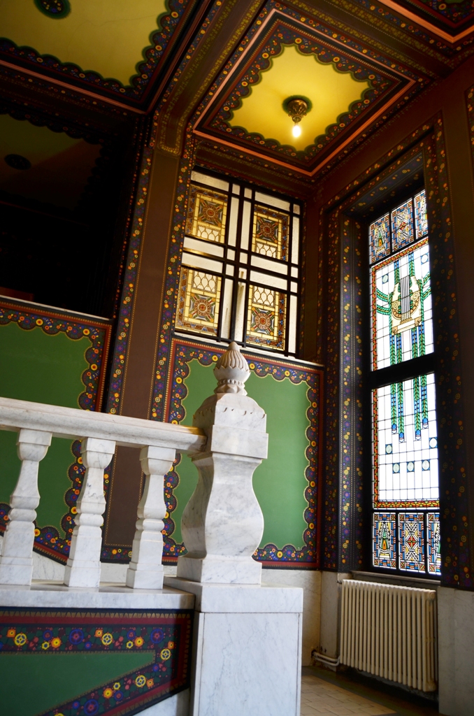 Scările din marmură te vor duce spre celelalte două săli emblematice ale palatului. Urcându-le, vei observa vitraliile cu chipuri de personalități, precum Liszt. La etaj e vizitabilă Sala Oglinzilor, al cărei nume se trage de la cele două grupuri de câte trei oglinzi de cristal care mărginesc, în cele două capete, încăperea. Marea atracție de aici o reprezintă însă cele 12 vitralii care ocupă întreg peretele de la stradă, ele prezentând scene din balade și legende secuiești cu subiect tragic. Sală de protocol luxoasă, mobilată elegant, încăperea aceasta ilustrează subtila îmbinare dintre stilul popular şi pomenitul Secession, impus, precum se știe, la sfârșitul veacului al nouăsprezecelea, de Klimt și alți artiști vienezi.