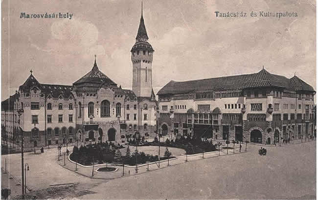 Arhitecții însărcinați cu proiectarea clădirii au fost budapestanii Komor Marcell și Jakab Dezső, care mai creaseră în Ardeal clădiri în stilul Secession maghiar, ba chiar, în Tg.-Mureș, în vecinătate, actualul sediu al Consiliul Județean și al Prefecturii mureşene (pe atunci primărie).