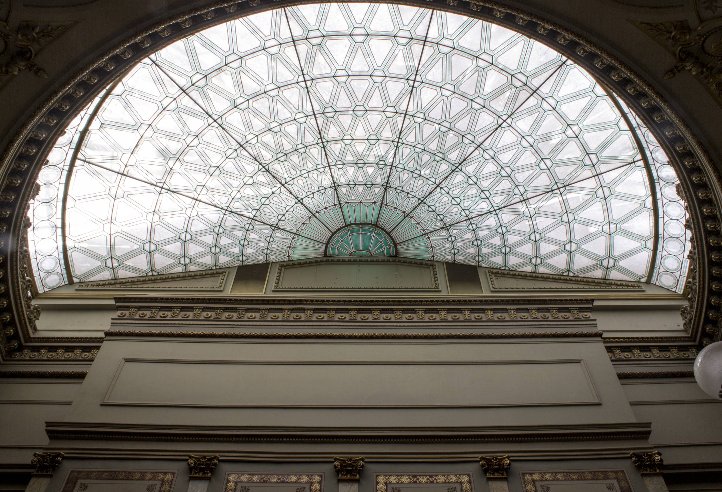 Patru scări monumentale în spirală, de tip baroc, din marmură de Carrara ce găzduiesc balcoane la etajul intermediar îi conduc pe vizitatori spre sala de concerte.