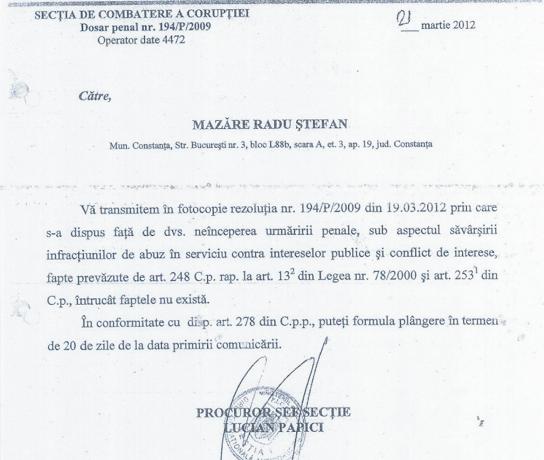 Decizia de NUP, comunicată edilului, poartă semnătura celebrului procuror DNA Lucian Papici, unul dintre cei mai performanţi luptători împotriva corupţiei.