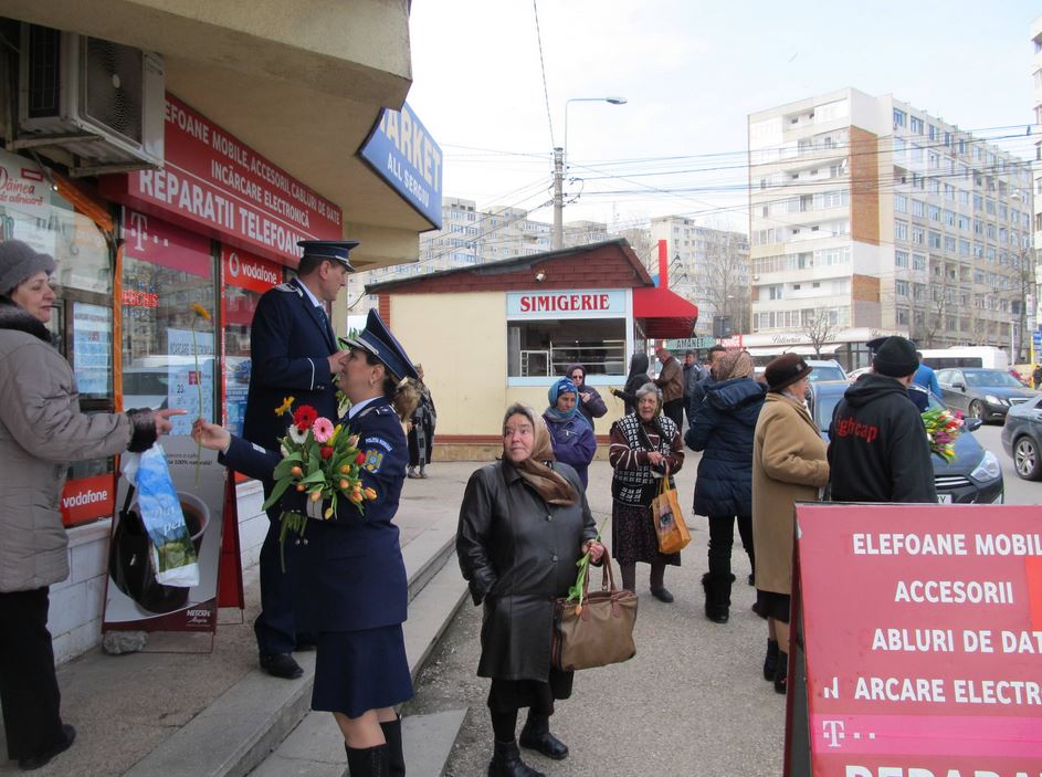 Astăzi, începând cu ora 11.00, în zona Tomis III din Constanţa, poliţiştii Serviciului Ordine Publică împreună cu cei ai Biroului de Analiză şi Prevenire a Criminalităţii din cadrul I.P.J. Constanţa, le-au oferit flori doamnelor şi domnişoarelor din Constanţa, cu ocazia Zilei Internaţionale a Femeii.