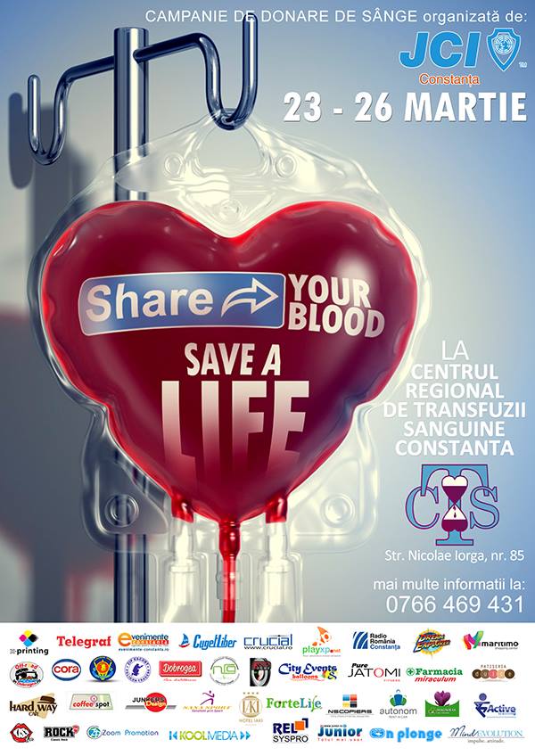 Luni debutează campania „Share your blood – Save a life” organizată de JCI Constanța care îi îndeamnă pe toți constănțenii să doneze sânge pentru semenii aflați în dificultate. Coordonatorul campaniei, Ioan Malciu, reprezentant JCI Constanța a vorbit în interviul dimineții cu Larisa și Cristi despre importanța donării regulate de sânge menționând faptul că tinerii sunt primii cărora li se adresează această campanie. Marți, la ora 12.00, voluntarii JCI Constanța vor fi prezenți la Centrul Regional de Transfuzii Sanguine din Constanța de la Spitalul Județean unde vor dona sânge și îi vor aștepta pe constănțenii între 18 și 65 de ani să le urmeze exemplul. Campania se derulează în perioada 23 – 26 martie și se va desfășura cu acțiuni periodice de-a lungul anului.