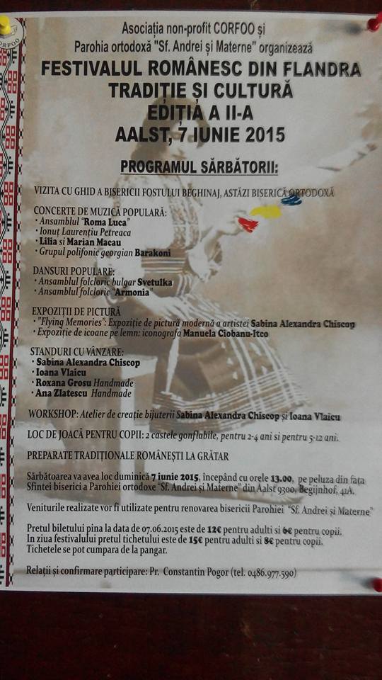 Martor și interpret la manifestarea de la Aalst, Belgia, Ionuț Petreacă ne-a relatat în cadrul emisiunii:”Interferențe dobrogene”, despre această frumoasă inițiativă a Bisericii Fostului Beghinaj, astăzi Biserica Ortodoxă Sf. Andrei , în care slujbele se țin în limba română. De altfel, fondurile obținute vor folosi la renovarea bisericii, potrivit preotului Constantin Pogor.