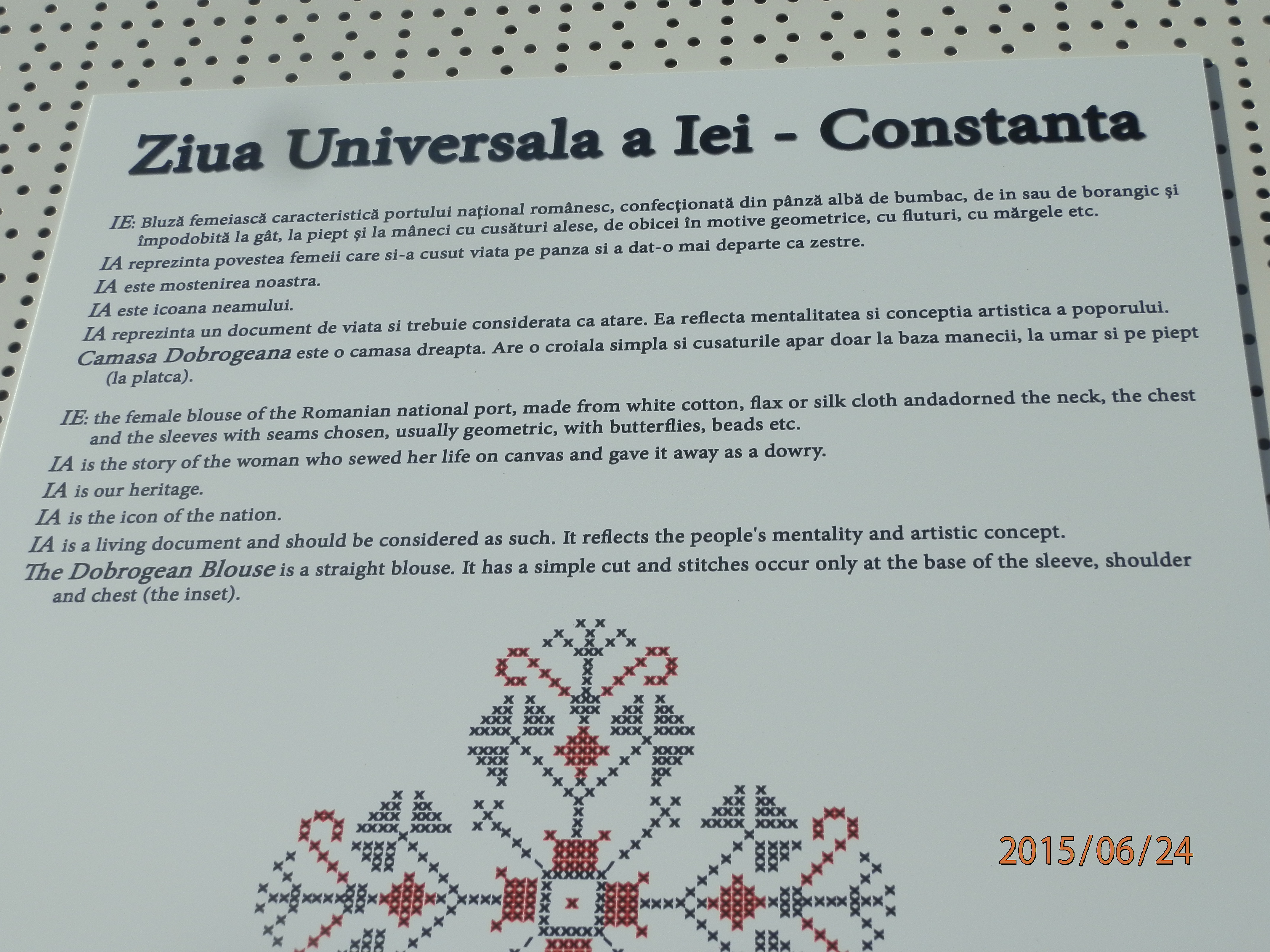 Mai multe puteți afla de la Muzeul de Artă Populară Constanţa care prezintă în aceste zile expoziţia: „Cămaşa românească”, în care sunt prezentate cămăşi şi ii de patrimoniu, din toate provinciile istorice ale ţării: Transilvania, Banat, Oltenia, Muntenia, Moldova şi Dobrogea, care oferă o imagine de ansamblu asupra evoluţiei în timp şi spaţiu a cămăşii femeieşti tradiţionale, până la ie, devenită o modă vestimentară a zilelor noastre.