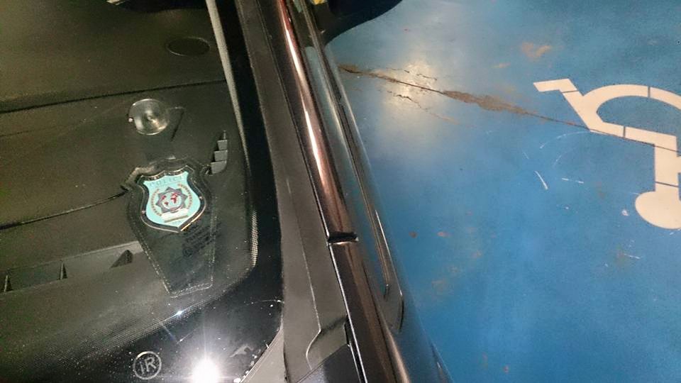 Este vorba de o mașină cu numere de Arad, parcată pe două locuri rezervate pentru persoanele cu handicap, iar în parbrizul autoturismului este afișată la vedere o insignă emisă de Asociația Internațională a Poliției (http://www.ipa-iac.org/index.php).