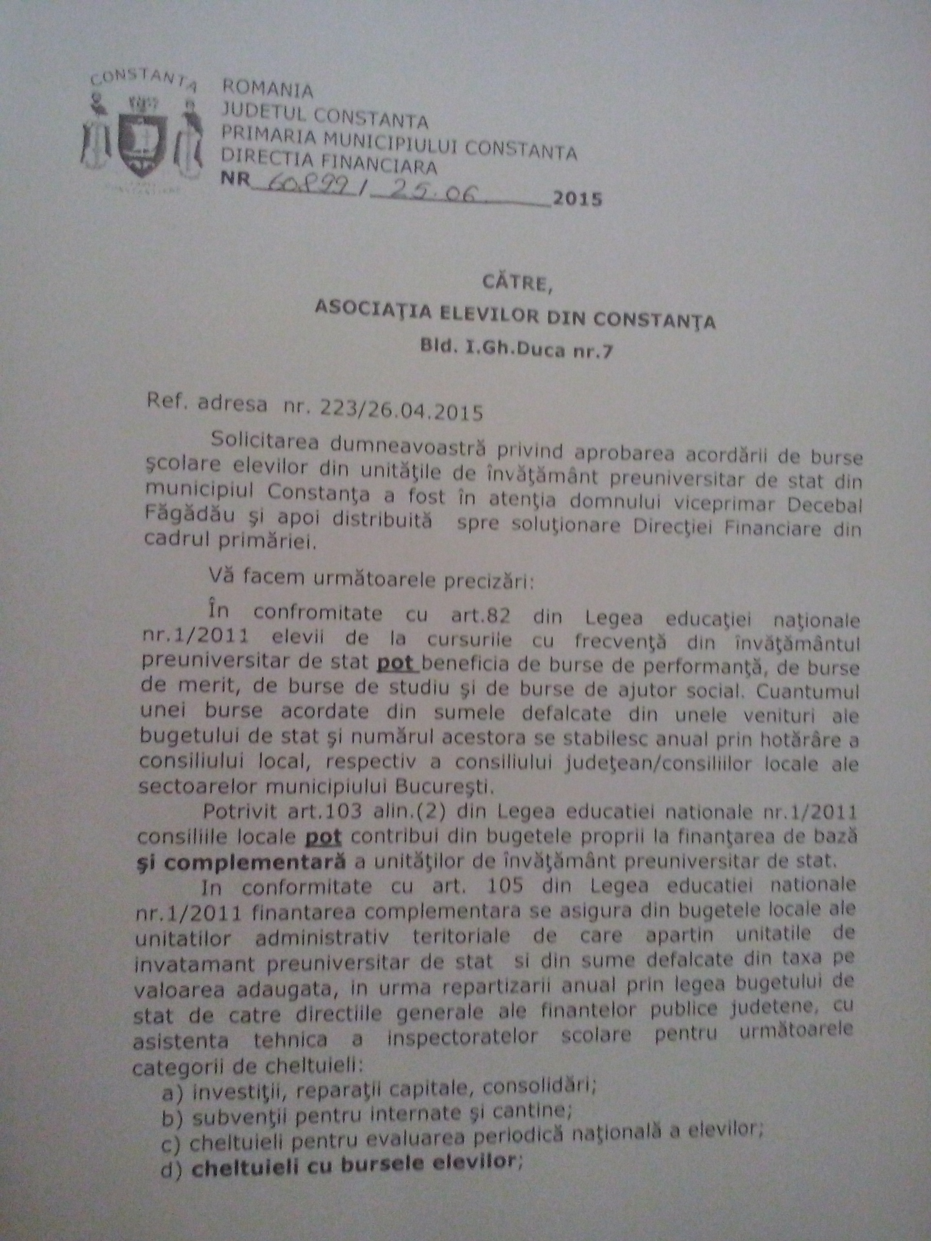 De cealaltă parte, Primăria Constanţa prin vocea purtătorului de cuvânt spune că aceste burse se acordă facultativ. Liviu Tramudana.