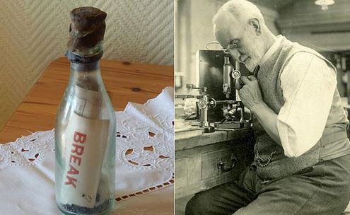 Pentru asta, el a aruncat în Marea Nordului o mie de sticle cu mesaje de acest fel. Cele mai multe au fost prinse în năvoadele pescarilor câteva zeci de ani mai târziu. Altele au fost returnate aşa cum cererau autorii experimentului, iar cei care au ajutat la reuşita proiectului au fost recompensaţi cu un şiling.