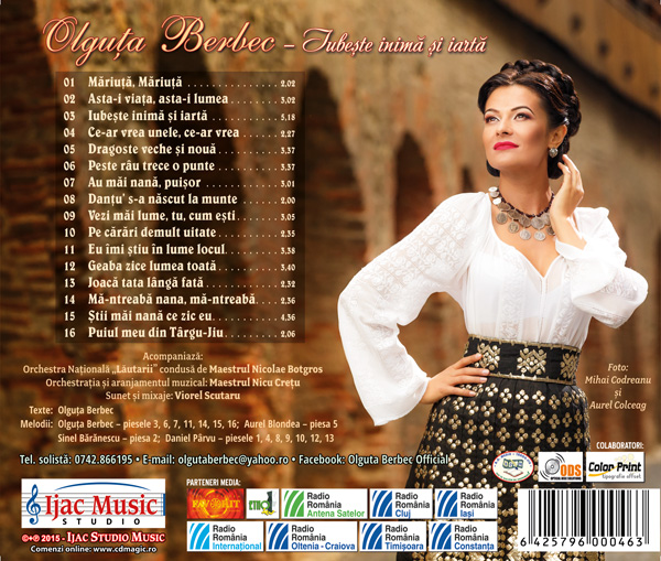 După “Floare pe munte crescui“(2007), „Florile de mac poartă noroc” (2009),“ De la Gorj la Mehedinți “(2012), noul album muzical :”Iubește inimă și iartă”(2015) al Olguței Berbec, cucerește publicul.