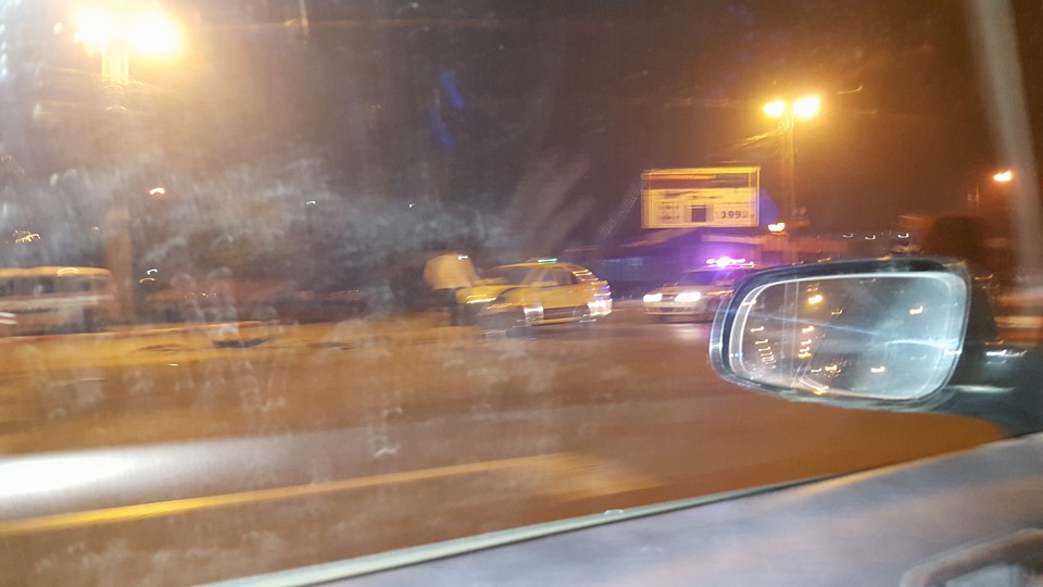 O maşină de poliţie şi un taxi, ambele marca Logan au intrat în coliziune, luni dimineaţa, la intersecţia străzii Pelicanului cu bulevardul Aurel Vlaicu, în zona CET.