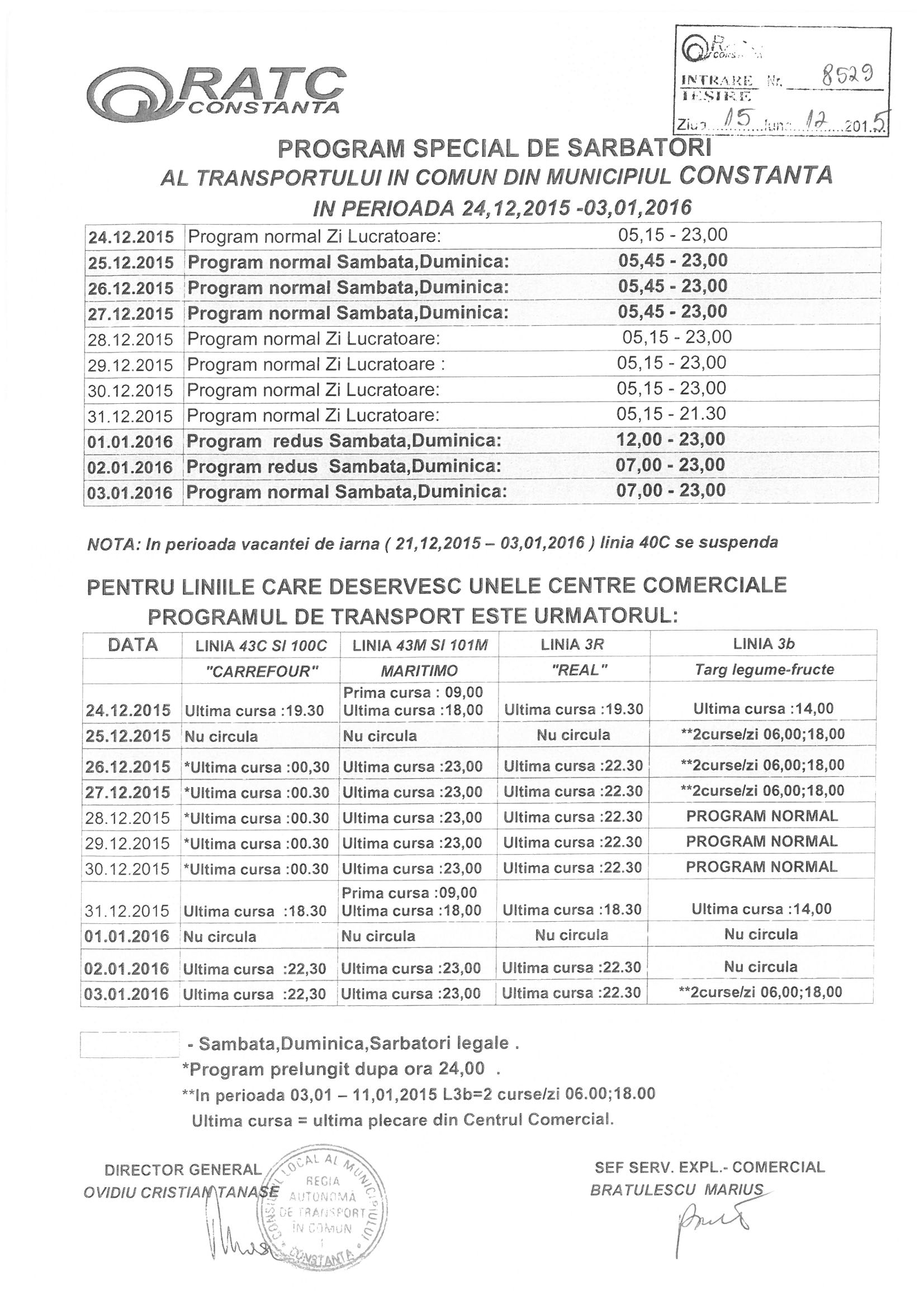 Autobuzele RATC Constanţa vor circula după program normal în perioada Sărbătorilor de iarnă, cu excepţia Crăciunului (25-27 decembrie) şi zilelor de Anul Nou (1-3 ianuarie), când orarul va fi de week-end. Liniile care deservesc centrele comerciale au, însă, un program special.
