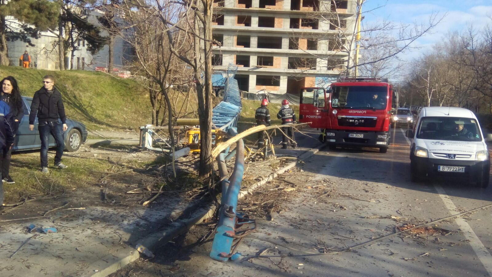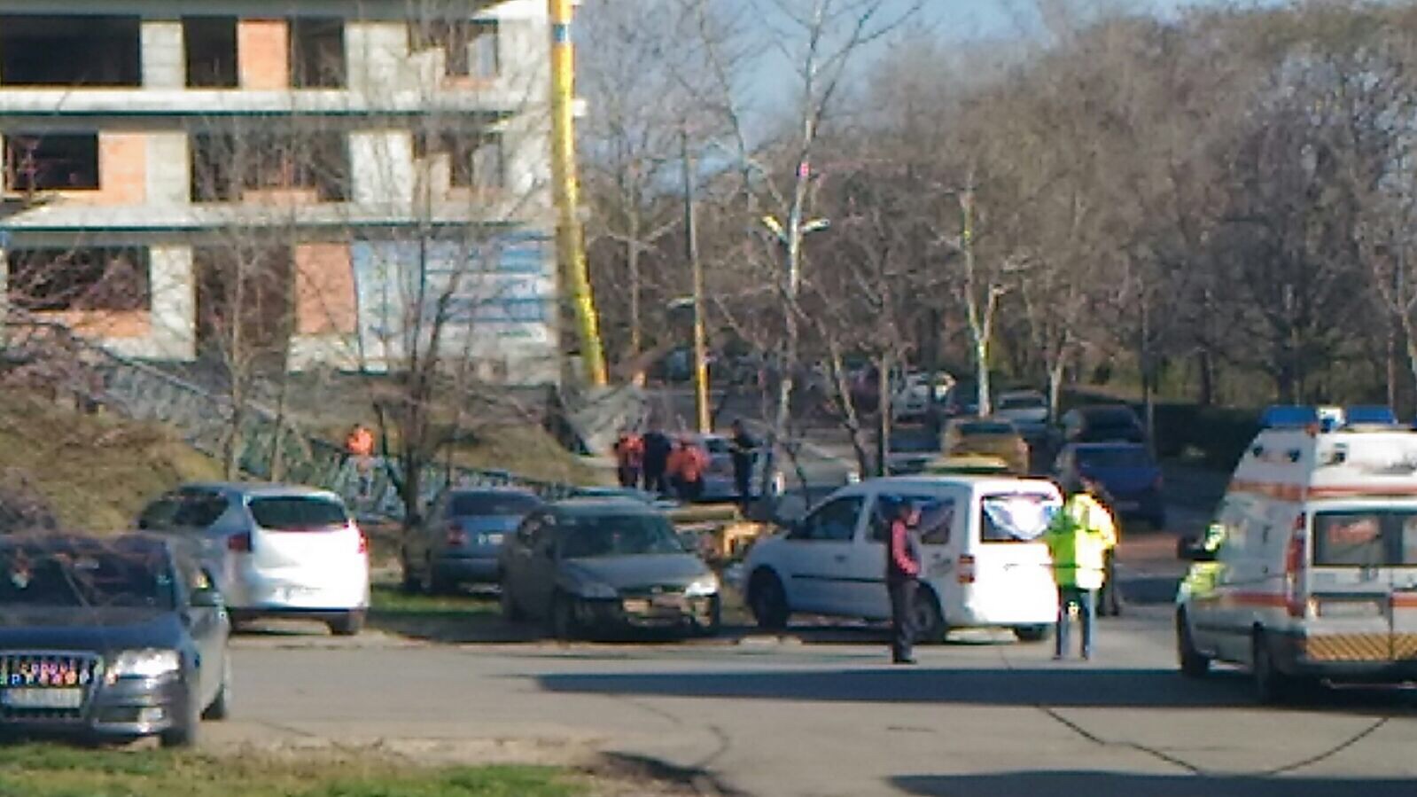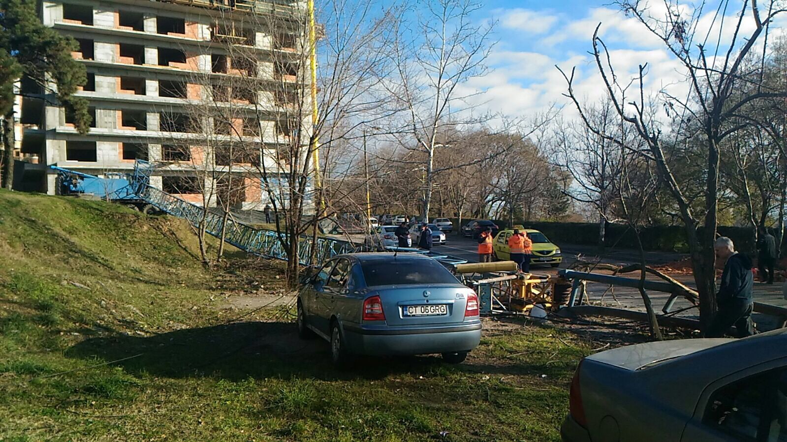 În cădere, brațul macaralei a lovit un stâlp de înaltă tensiune și a avariat două autoturisme.