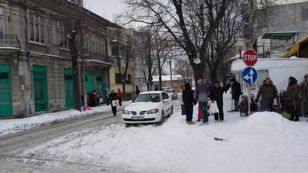 Deşi există porţii pentru toată lumea, cei mai mulţi aşteaptă ore în şir, în frig, să primească pachetul în care au o ciorbă, felul doi şi hrană rece în valoare de 12 lei.
