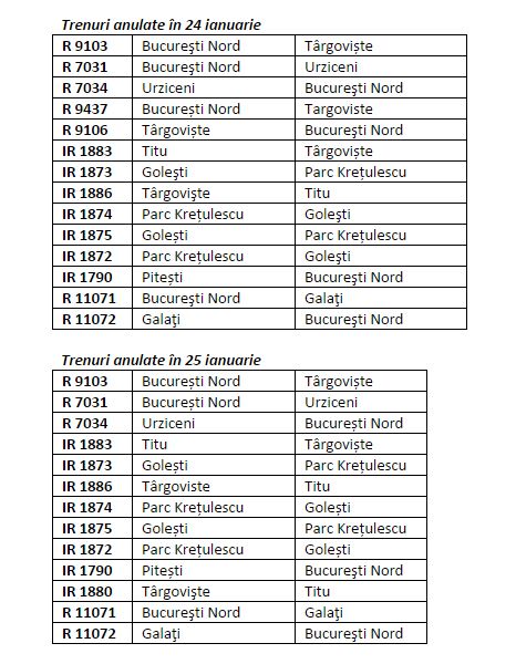 Pentru perioada 23-25 ianuarie, din cele peste 1200 de trenuri/zi ale CFR Călători, vor fi anulate mai multe trenuri, care reprezintă aproximativ 1% din numărul total de trenuri care circulă în fiecare zi. Traficul de pasageri este preluat, în măsura posibilităţilor, de celelalte trenuri rămase în grafice, se mai arată în comunicatul CFR Călători.