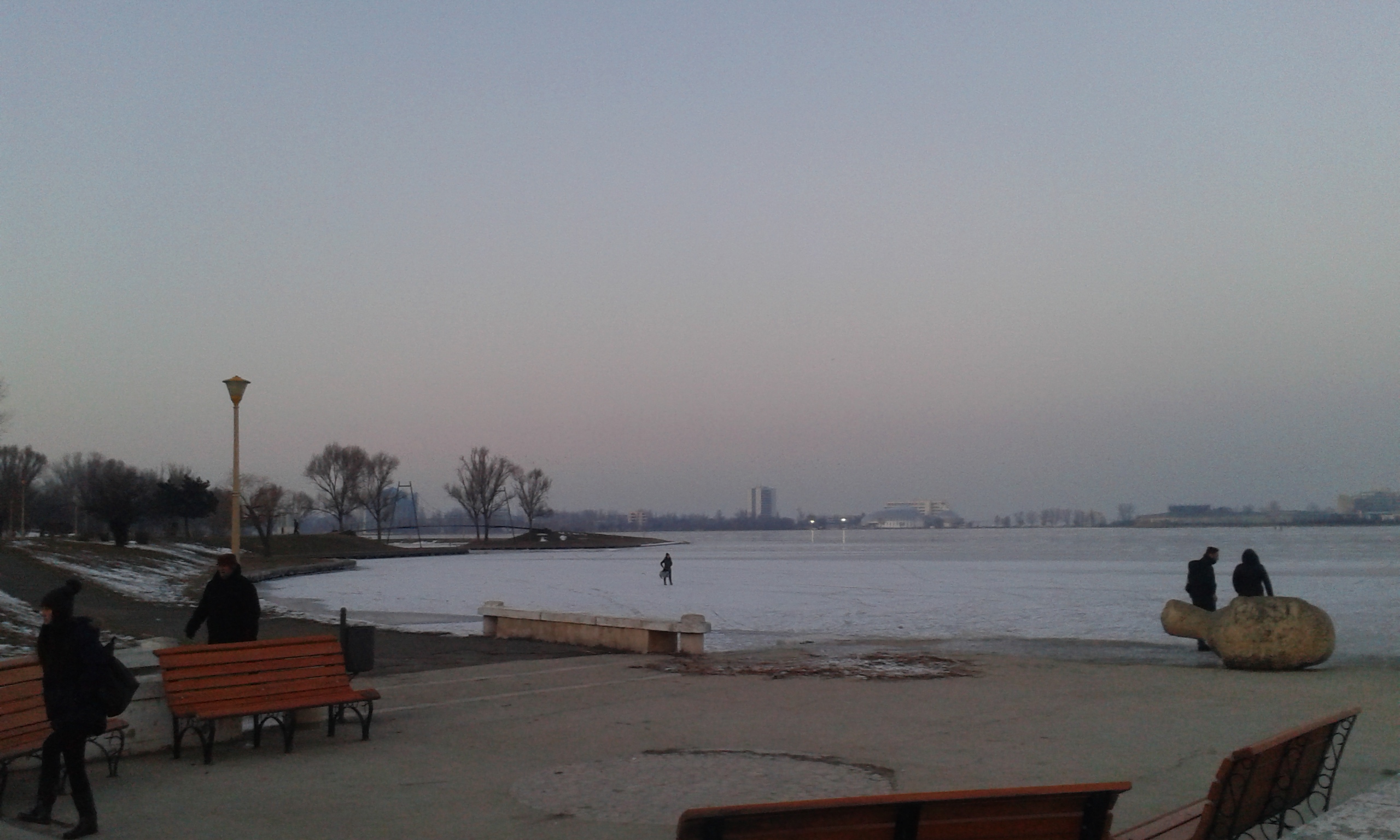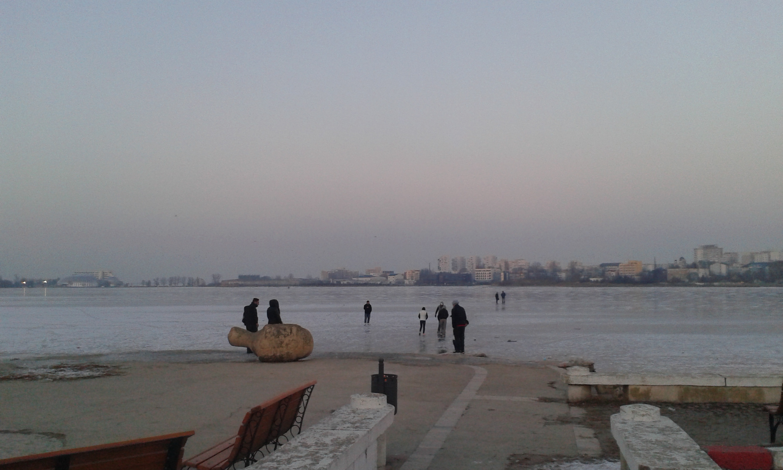 Două echipaje de la Poliţia Locală Constanţa şi cea Naţională se chinuie, luni seara, să scoată de pe apa îngheţată zeci de tineri care s-au aventurat „în larg”.