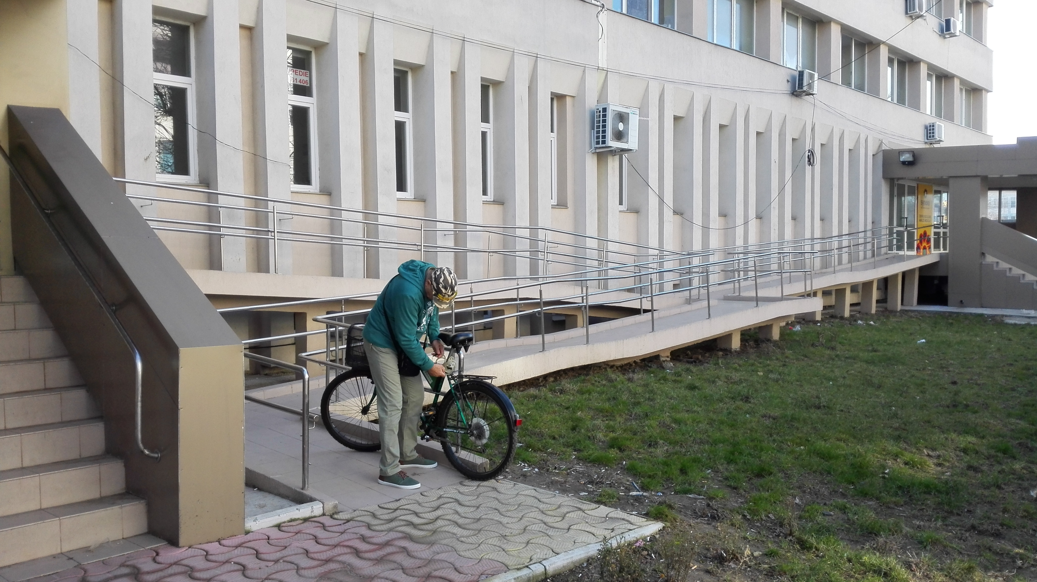 La Policlinca cu Plată din Constanţa, de pe strada Ştefan cel Mare, nu numai că nu există lift, dar rampa de acces este improvizată. Greu de crezut că o persoană aflată în scaun cu rotile poate urca pe scândurile aşezate peste treptele de la intrare.