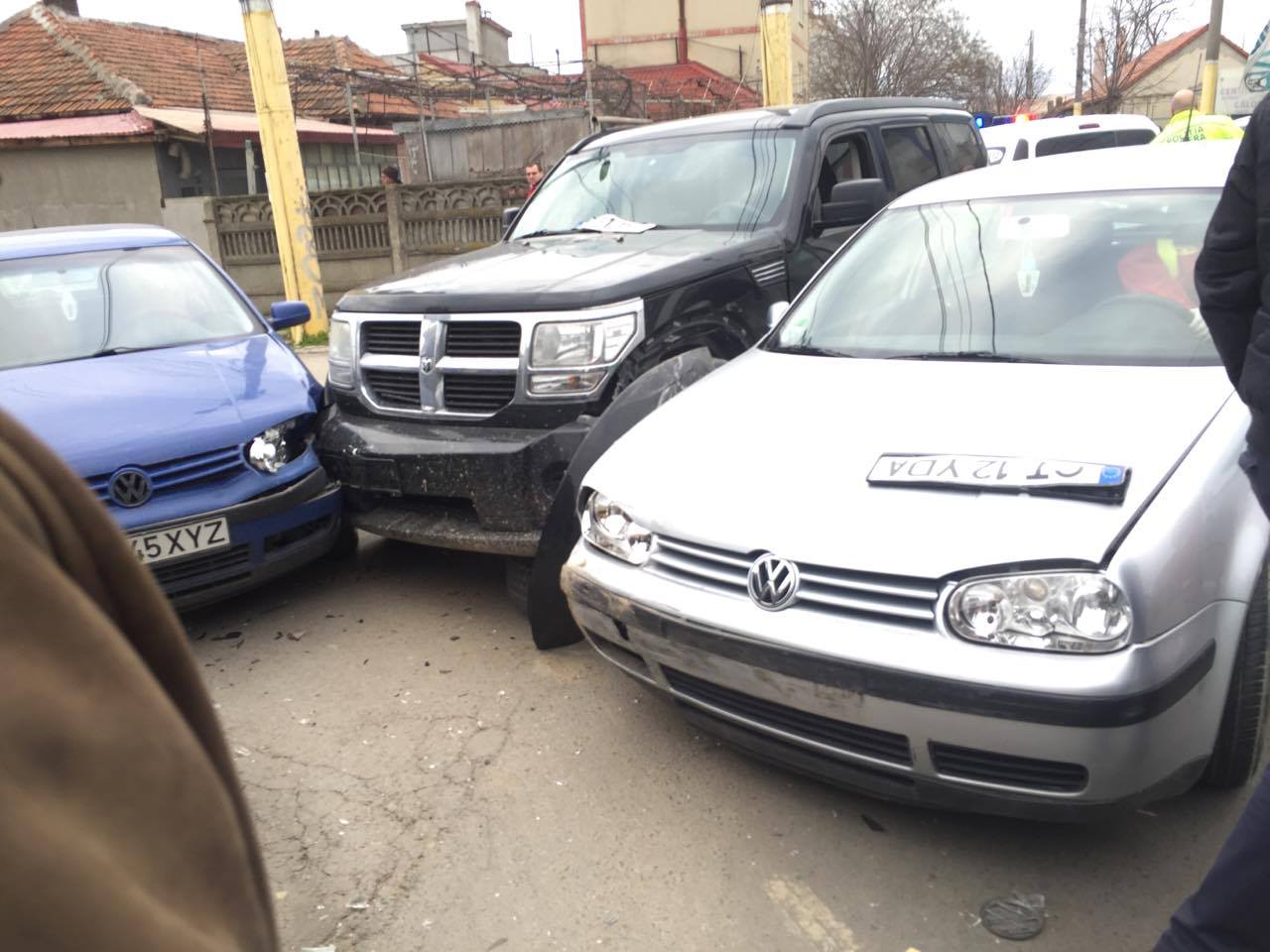 Două autoturisme s-au ciocnit violent, luni după-amiaza, la intersecția străzilor Baba Novac și Crinului, din municipiul Constanța. Unul dintre autoturisme a ricoșat într-o a treia mașină.