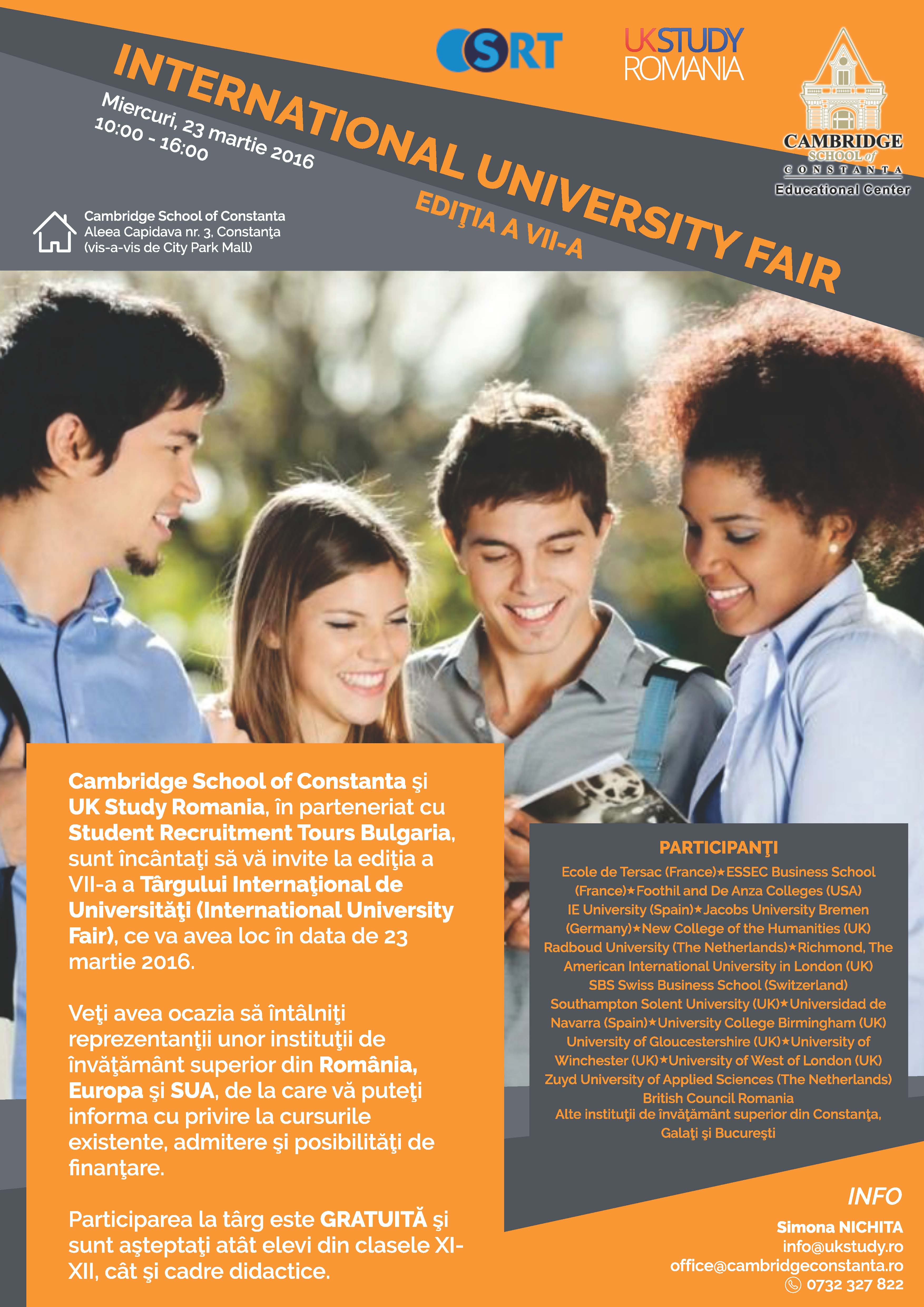 Târgul Internaţional de Universităţi se adresează elevilor din clasele a 11-a și a 12-a, care doresc să exploreze şi posibilitatea de a studia în străinătate. Participarea este gratuită, anunțându-se peste 1000 elevi din Dobrogea, care vor avea ocazia de a se întâlni cu reprezentanţii universităţilor expozante şi care se vor informa cu privire la cursurile existente, admitere şi posibilităţile de finanţare.