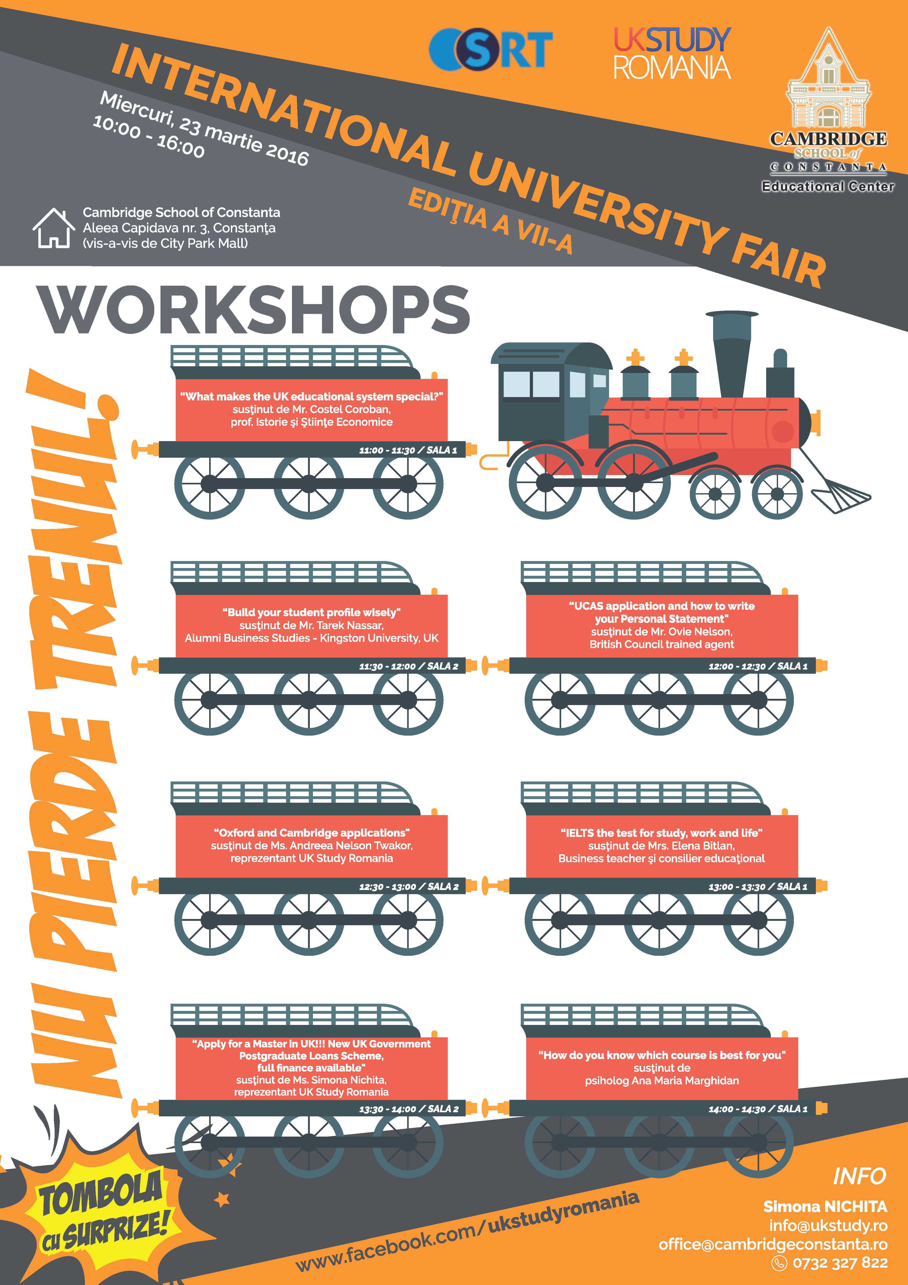 În cadrul evenimentului, cei interesați vor avea posibilitatea de a participa la workshop-uri legate de alcătuirea cu succes a unui portofoliu de student sau despre importanța alegerii celui mai potrivit domeniu de studiu şi la o tombolă cu surprize.