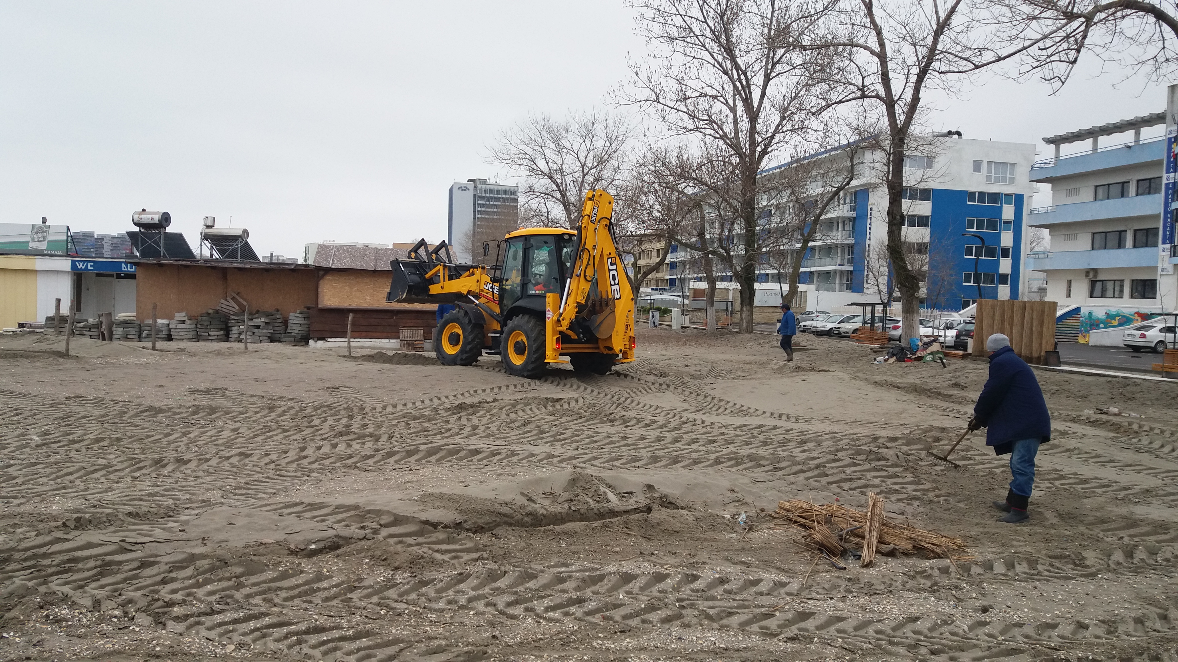 În Mamaia, utilajele ABADL nivelează nisipul pe plajă, iar angajații au început să strângă gardurile de stuf montate în toamnă la limita falezei pentru ca vântul să nu împrăștie nisipul.