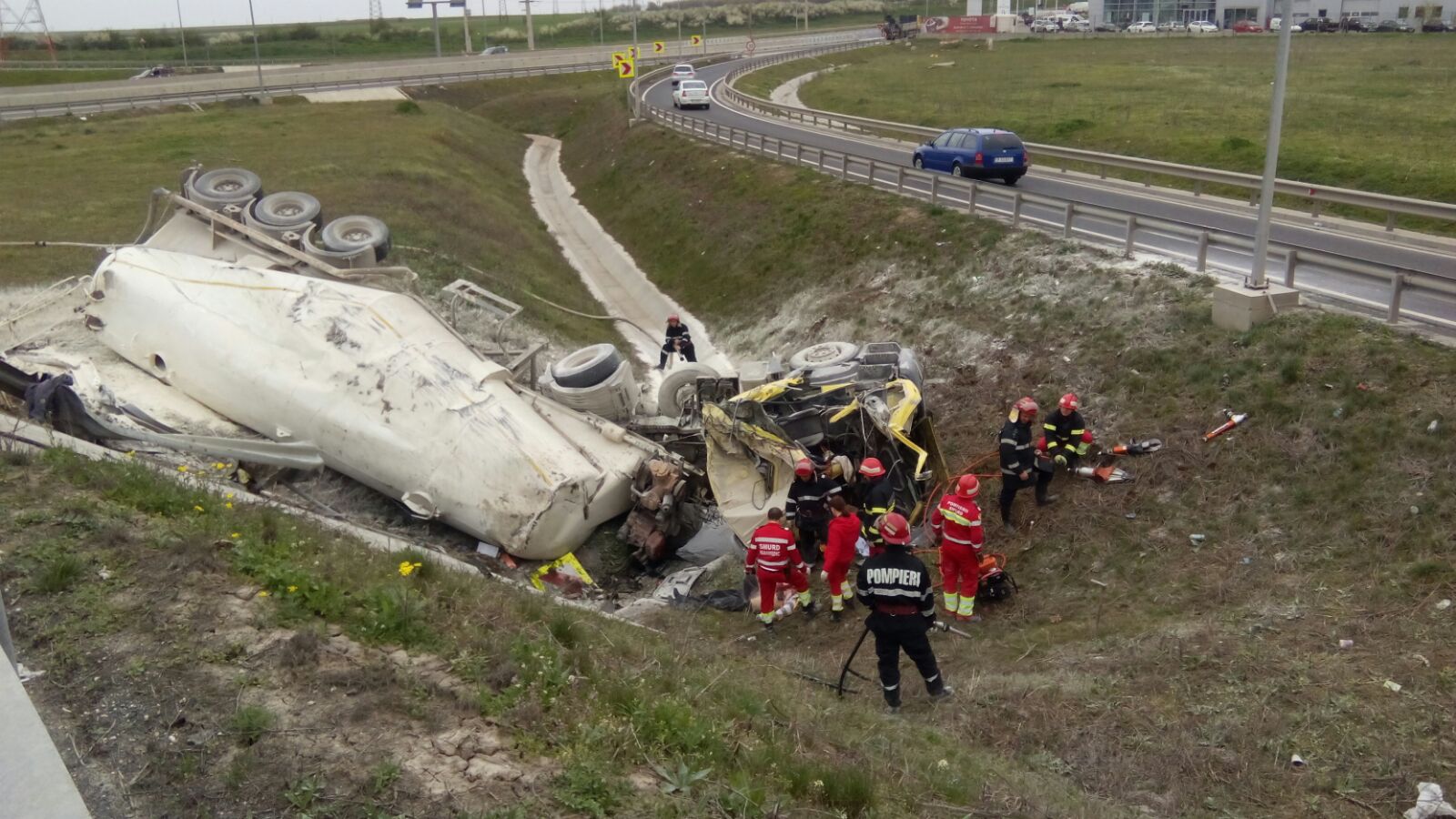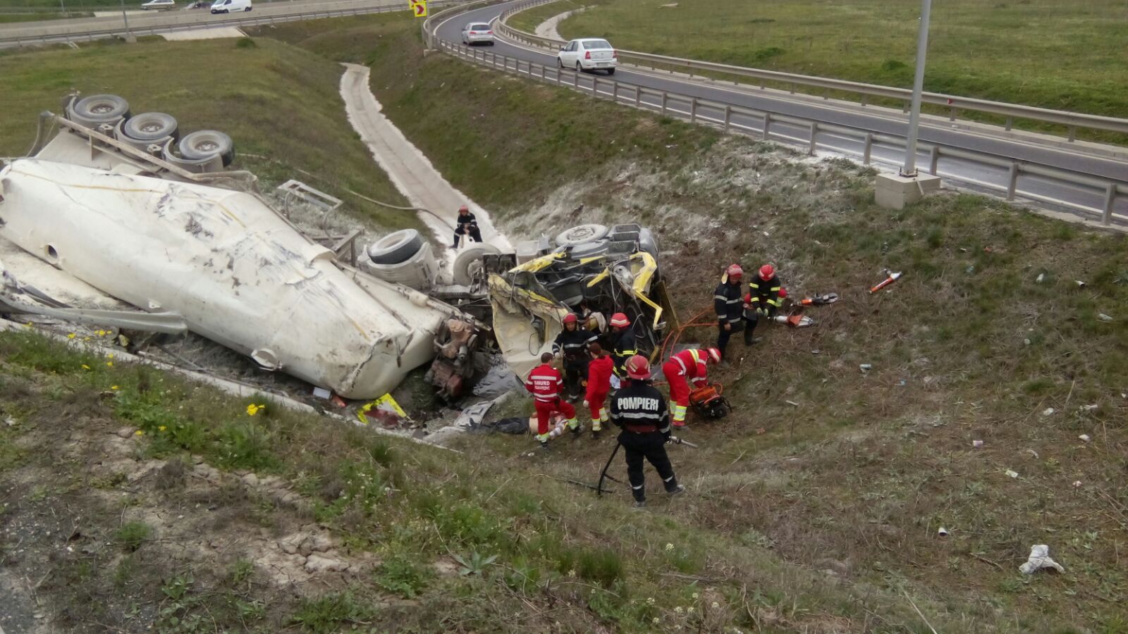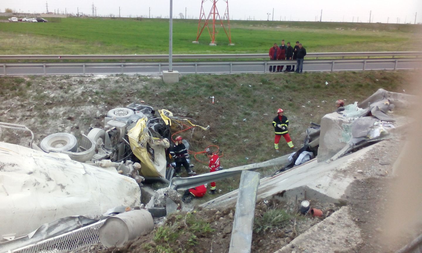 El a rămas încarcerat, și a fost declarat decedat de paramedici. Intervenția pompierilor de la Descarcerare este extrem de dificilă, întrucât TIR-ul încărcat cu ciment a zdrobit, practic, cabina.