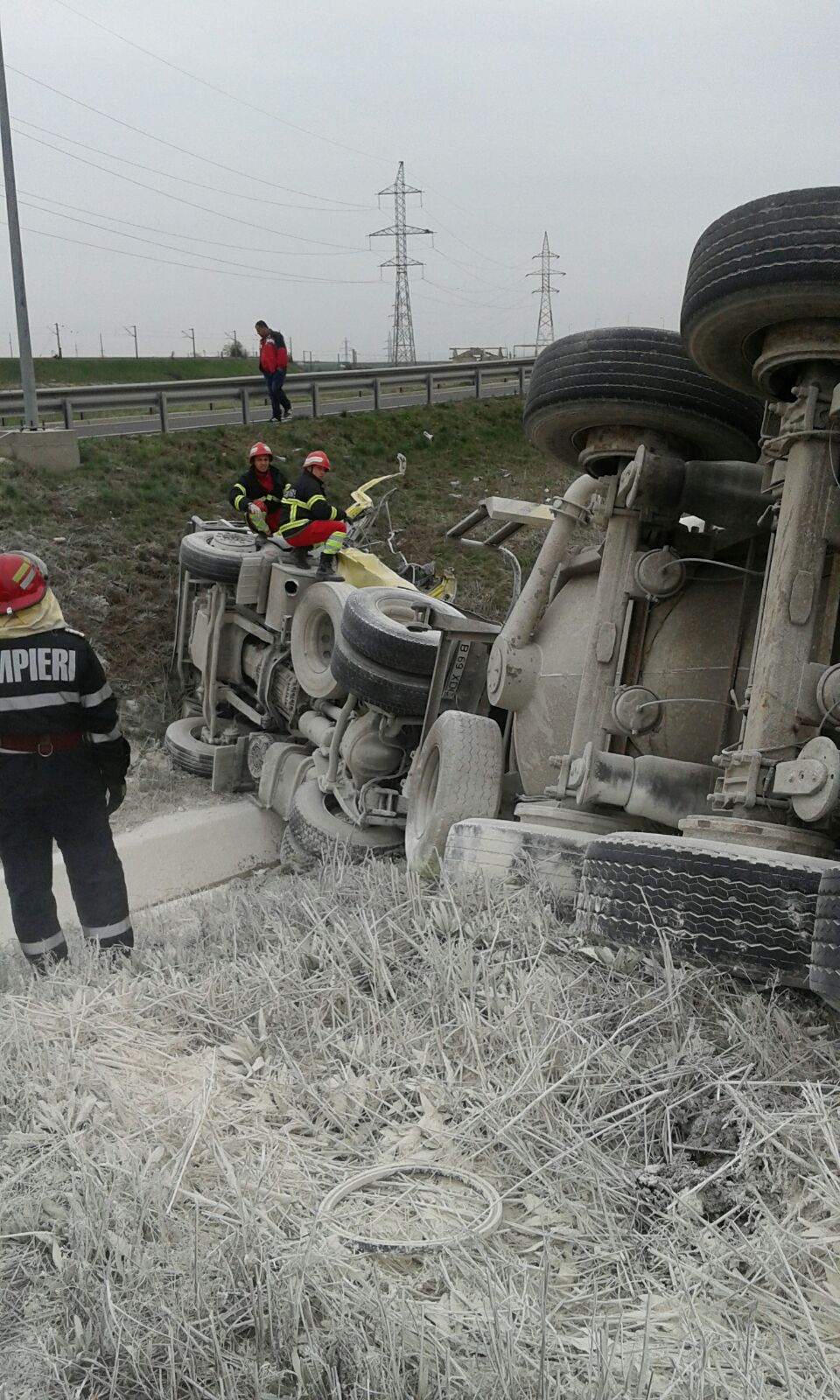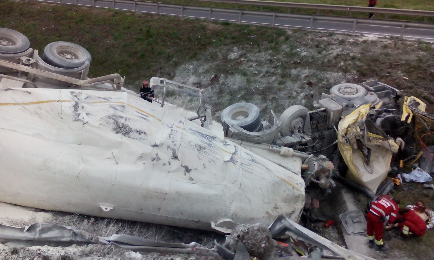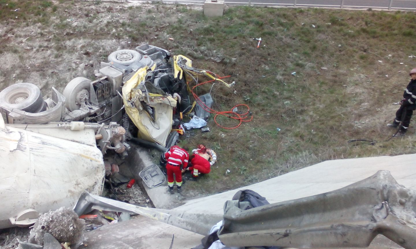 El a rămas încarcerat, și a fost declarat decedat de paramedici. Intervenția pompierilor de la Descarcerare este extrem de dificilă, întrucât TIR-ul încărcat cu ciment a zdrobit, practic, cabina.