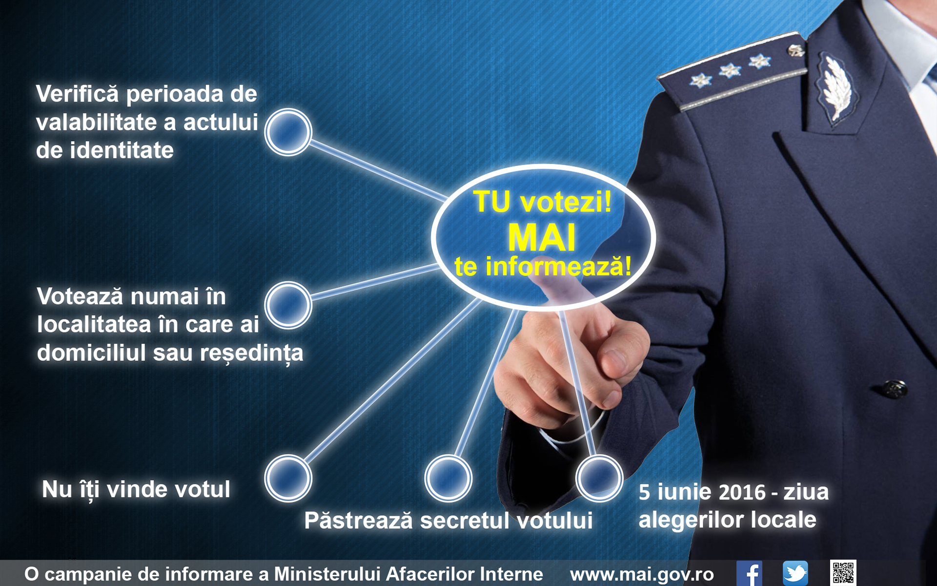 În contextul organizării alegerilor locale din acest an, M.A.I. desfășoară o campanie de informare a cetățenilor cu privire la principalele prevederi legale referitoare la exercitarea dreptului de vot.
