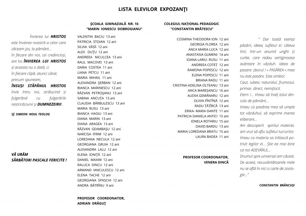 Sunt abordate două teme – ,,Omagiul lui Constantin BRÂNCUȘI”, lucrări inspirate și interpretări ale temelor abordate de sculptorul român și lucrări dedicate Sărbătorilor Pascale.