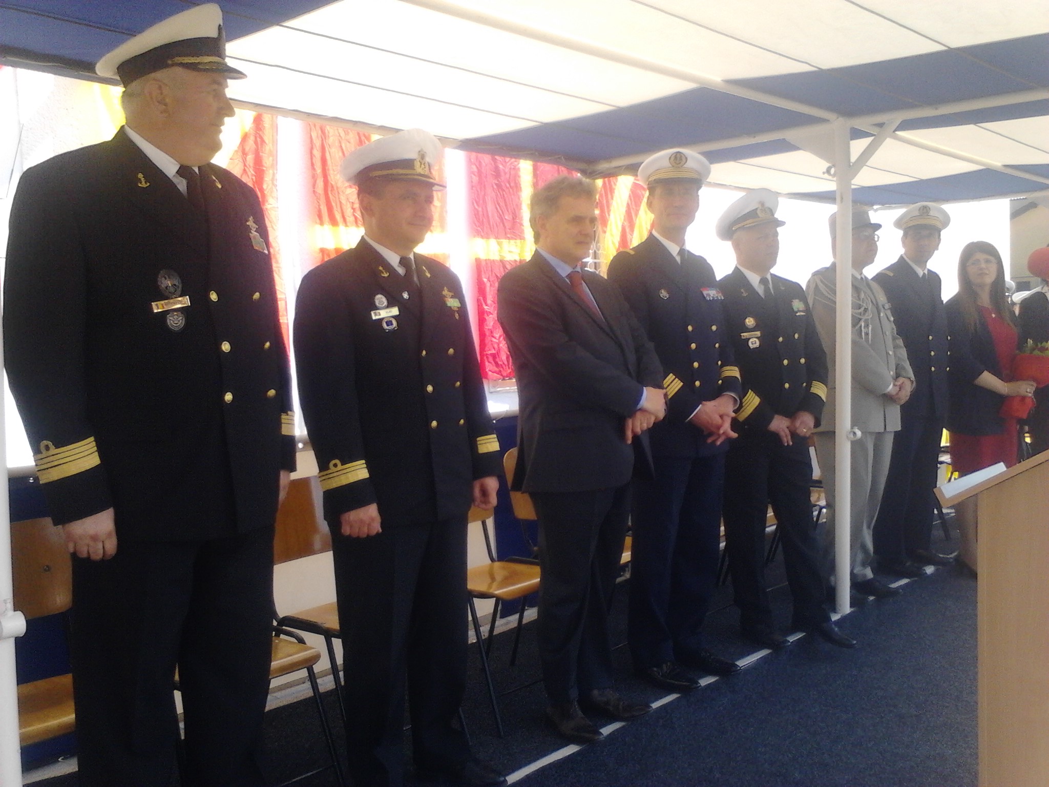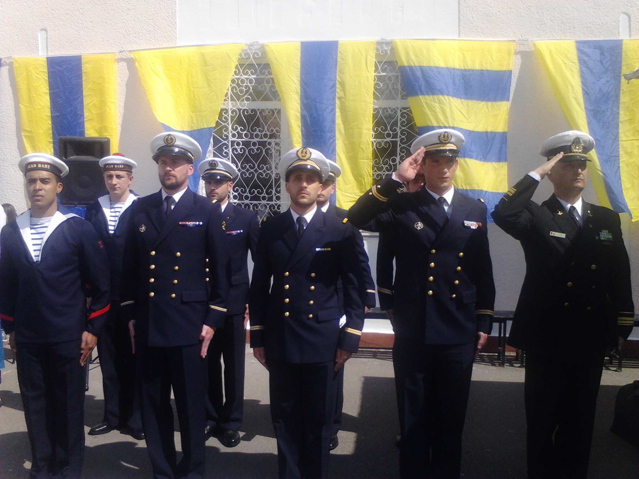 La ceremonie sunt prezenţi ambasadorul Franţei în România, excelenţa sa François Saint-Paul, ataşatul militar francez la Bucureşti, col. dr. ing. Christophe Midan, comandantul Fregatei „Mărăşeşti”, comandorul Cornel-Eugen Cojocaru, precum şi reprezentanţii Fregatei franceze „Jean Bart”.