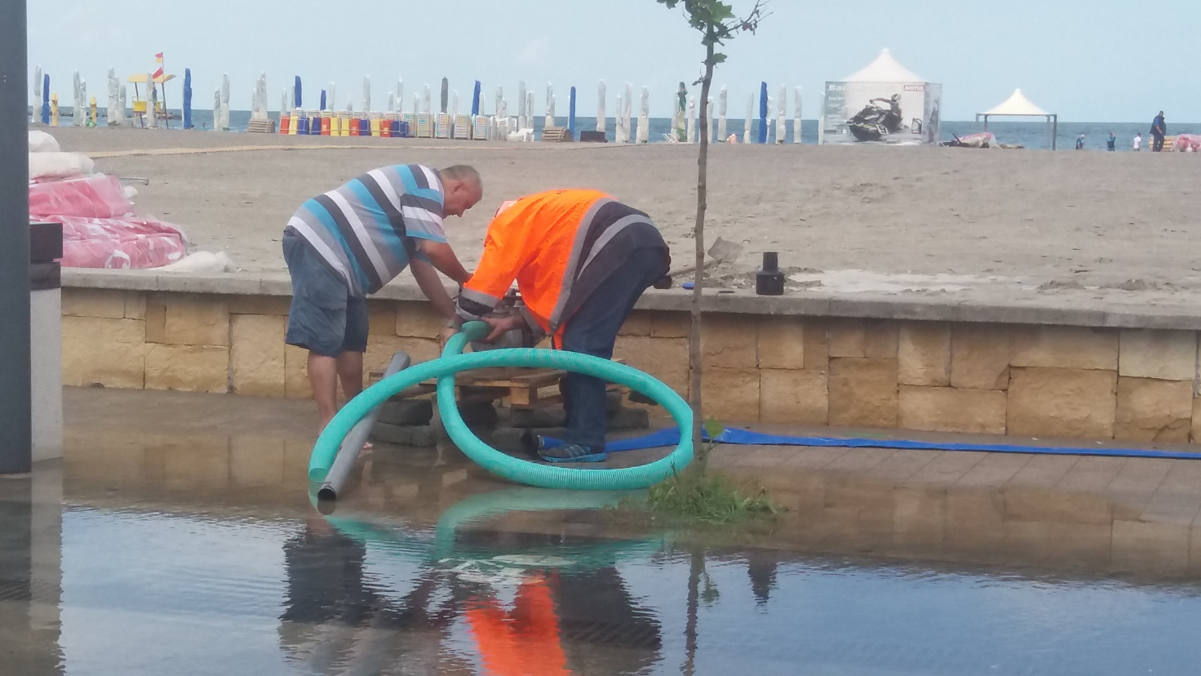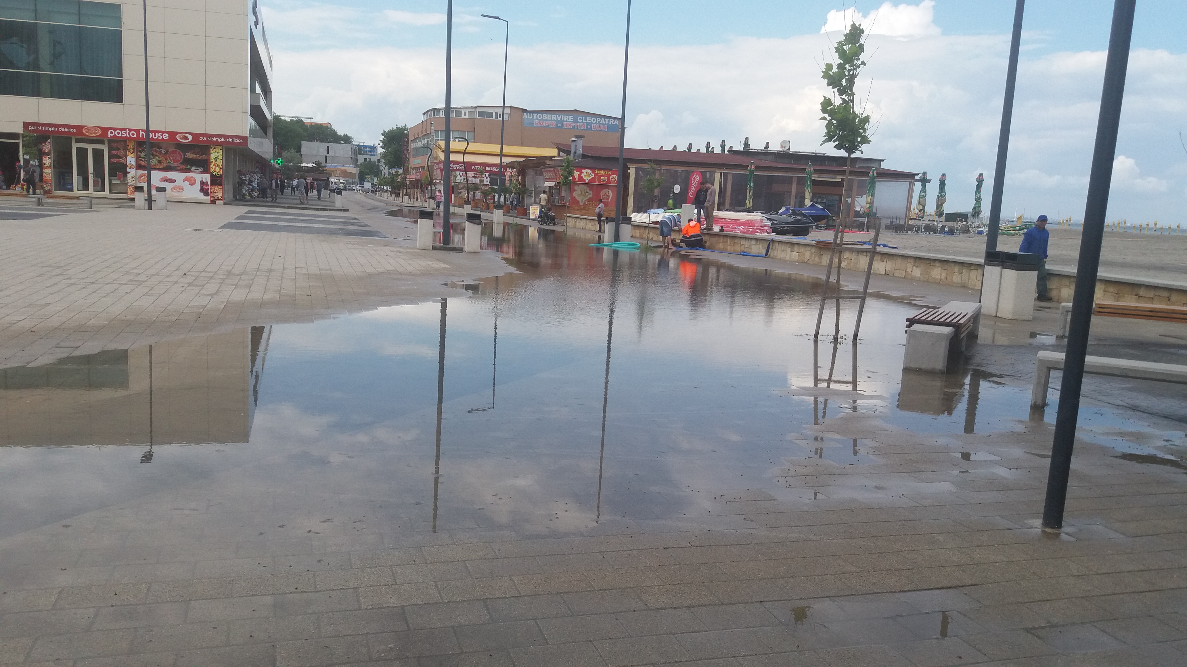 Mai mulți agenți economici încearcă la această oră (14.17) să tragă apa adunată pe faleza din stațiunea Mamaia, cu ajutorul unei motopompe.