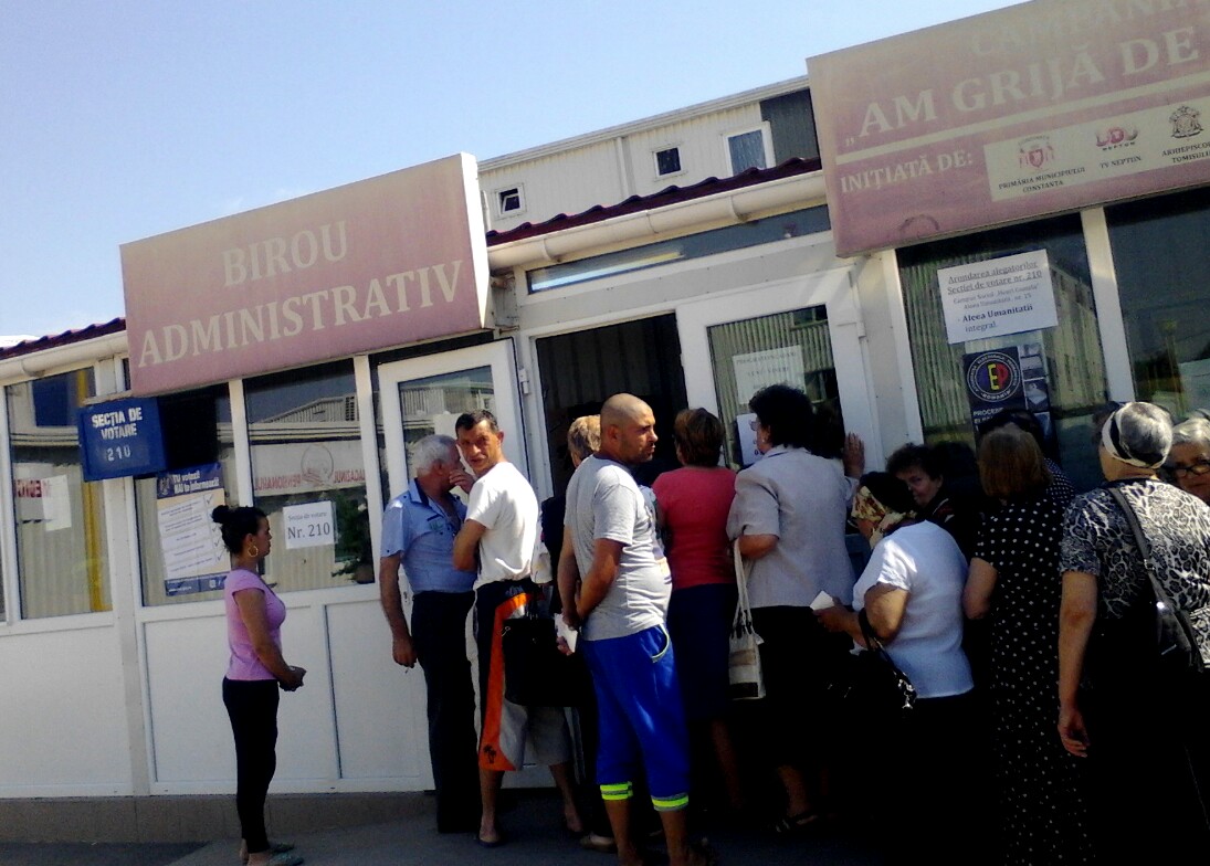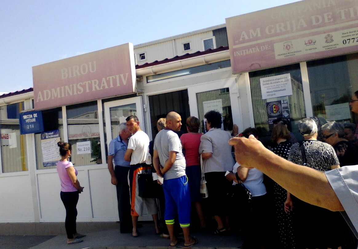 Locatarii din Campusul social Henri Coandă din municipiul Constanța au format cozi la Secția de votare amenajată în interiorul stabilimentului. Imaginile sunt surprinse în jurul orei 11.00.