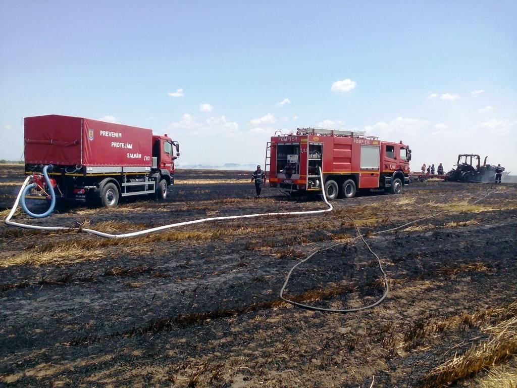 La sosirea echipajelor de stingere, incendiul se manifesta cu flacără deschisă la un utilaj agricol și la miriștea de orz pe o suprafață de aproximativ 15 hectare, existând risc de extindere a arderii la vecinătăți.