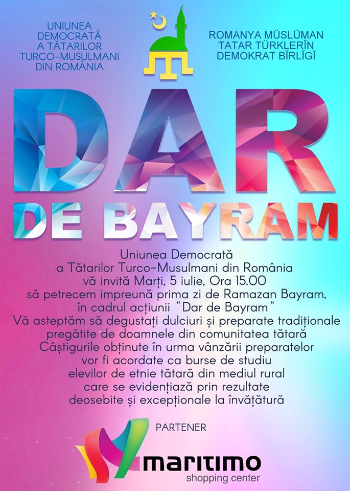 Conform comunicatului de presă transmis de UDTTMR, anul acesta cu ocazia Ramazan Bayram, Uniunea Democrată a Tătarilor Turco – Musulmani din România organizează marți, 5 iulie, prima ediție a acțiunii caritabile „Un dar de Bayram”. Evenimentul va avea loc la Centrul Comercial Maritimo în prima zi de Ramazan Bayram, începând cu ora 15,00 și va consta în strângerea de fonduri pentru acordarea de burse pentru elevi de etnie tătară din mediul rural, cu rezultate deosebite la învățătură. În acest sens la standurile special amenajate din incinta Centrului Comercial Maritimo vor fi puse în vânzare dulciuri tradiționale tătărești, care se pregătesc cu prilejul Ramazan Bayram-ului. Delicioasele baclavale, saraili sau minuni vor fi preparate de membrele organizațiilor de femei din cadrul filialelor UDTTMR. Nu vor lipsi nici surprizele pentru cei care vor achiziționa produse de la standurile noastre. Evenimentul se va desfășura în acordurile muzicii tradiționale tătărești. Cu cât suma strânsă va fi mai mare, cu atât numărul burselor va fi mai mare. Pe lângă banii strânși din vânzarea produselor, toți cei care doresc să contribuie cu bani o pot face prin donații.