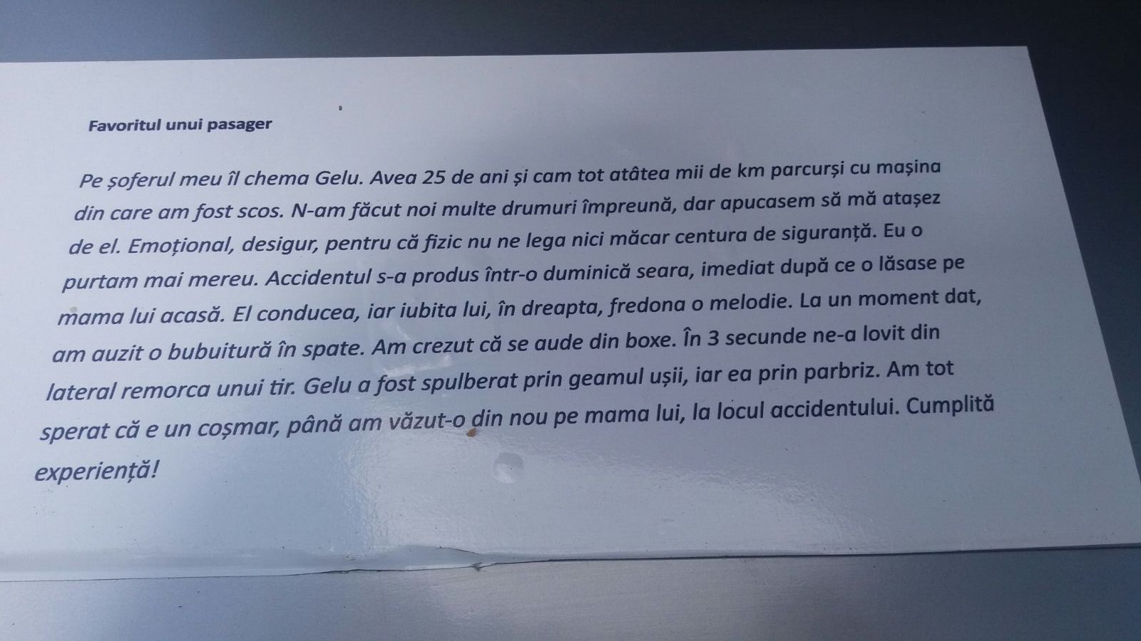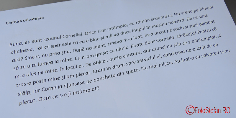 Bună, eu sunt scaunul Corneliei. Orice s-ar întâmpla, eu rămân scaunul ei. Nu vreau pe nimeni altcineva. Tot ce sper este că ea e bine şi mă va duce înapoi în maşina noastră. De ce sunt aici? Sincer, nu prea ştiu. După accident, cineva m-a luat, m-a urcat pe soclu şi sunt plimbat să se uite lumea la mine. Eu n-am greşit cu nimic. Poate doar Cornelia, sărăcuţa! Pentru că m-a ales pe mine, în locul ei. De obicei, purta centura, dar atunci nu ştiu ce s-a întâmplat. A tras-o peste mine şi am plecat. Eram în drum spre serviciul ei, când ceva ne-a izbit de un stâlp, iar Cornelia ajunsese pe bancheta din spate. Nu mai mişca. Au luat-o cu salvarea şi au plecat. Oare ce s-o fi întâmplat?”