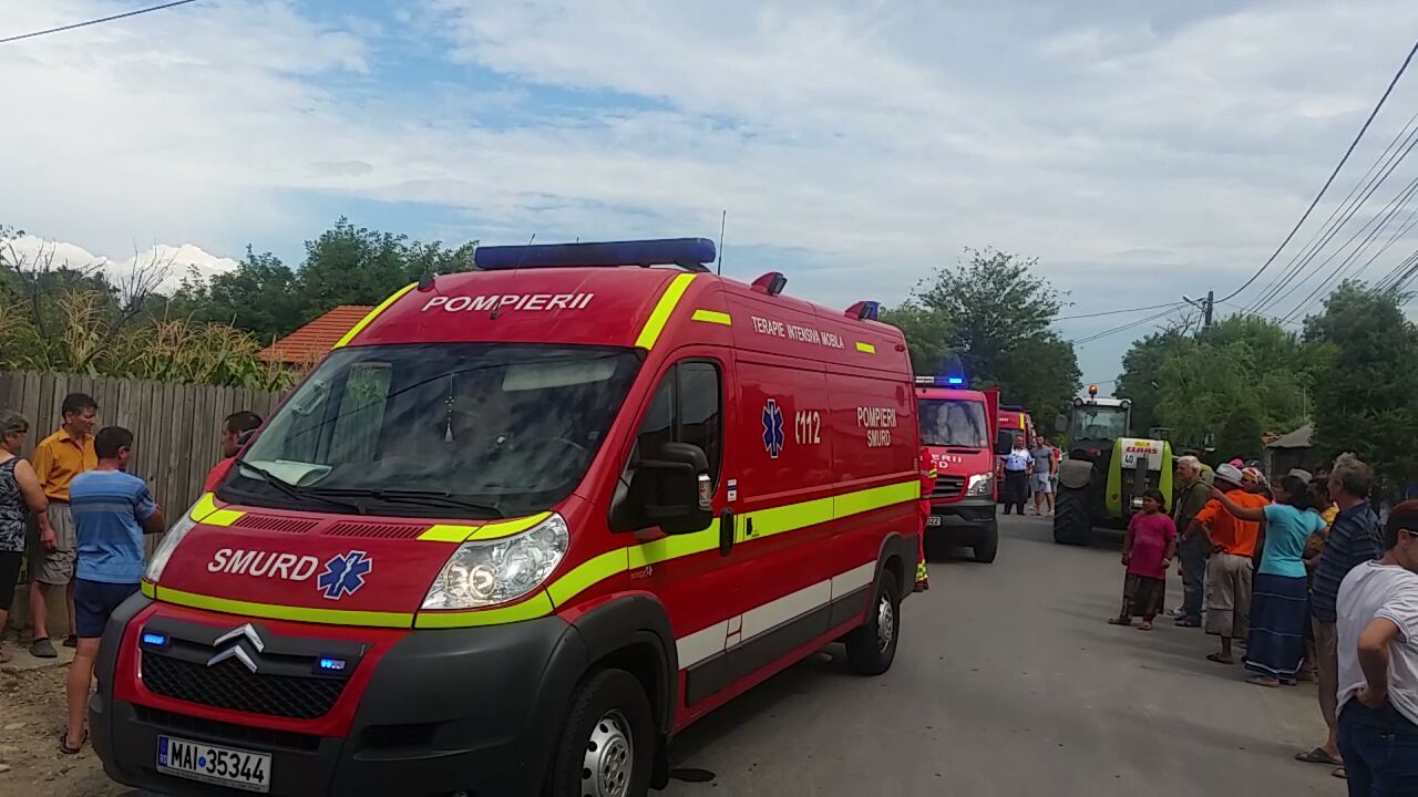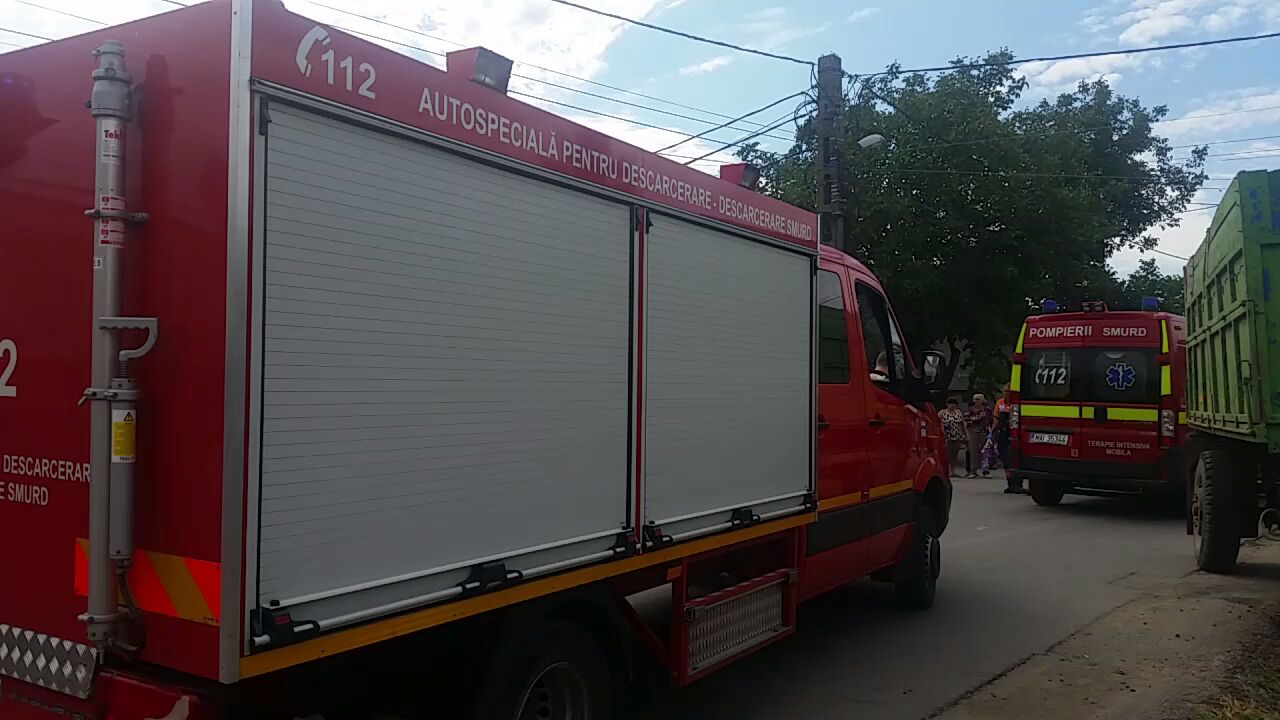 În urma impactului un copil a rămas încarcerat sub un utilaj agricol, iar pompierii din cadrul Inspectoratului pentru Situații de Urgență intervin cu un echipaj de la descarcerare.