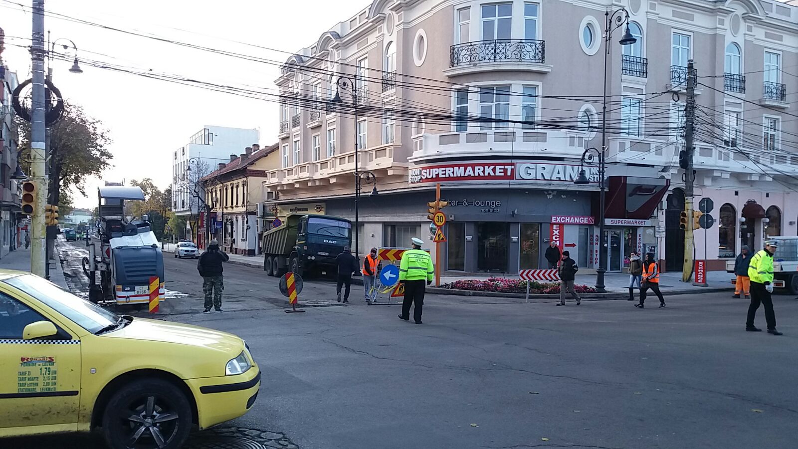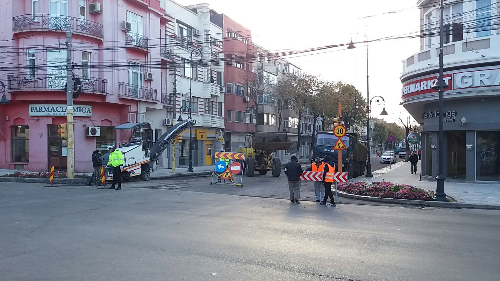 Circulația este oprită pe bulevardul Tomis, iar în zona Miga semafoarele sunt oprite. La fața locului se află un echipaj al Poliției Locale Constanța pentru a fluidiza traficul. Cu toate acestea, un șofer nu a respectat indicațiile polițiștilor și nici indicatoarele care avertizau că zona este blocată pentru executarea lucrărilor și a intrat pe tronsonul de drum care era închis.