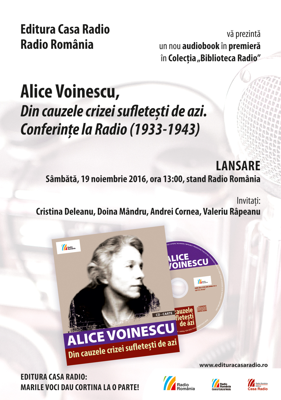 Sâmbătă, 19 noiembrie, ora 13:00: Lansarea audiobook-ului Alice Voinescu, Din cauzele crizei sufleteşti de azi. Conferinţe la Radio (1933-1943). Invitaţi: Cristina Deleanu, Doina Mândru, Andrei Cornea, Valeriu Râpeanu.