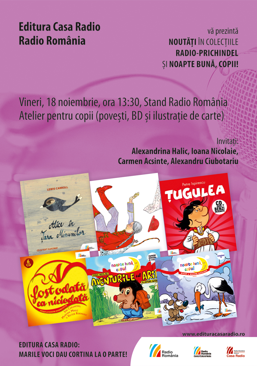 Vineri, 18 noiembrie, ora 13:30: Banda desenată, ilustraţia de carte, piesa radiofonică – lecturi pentru copii: noutăţi în colecţiile Radio-Prichindel şi Noapte bună, copii!. Invitaţi: Alexandrina Halic, Ioana Nicolaie, Carmen Acsinte, Alexandru Ciubotariu.
