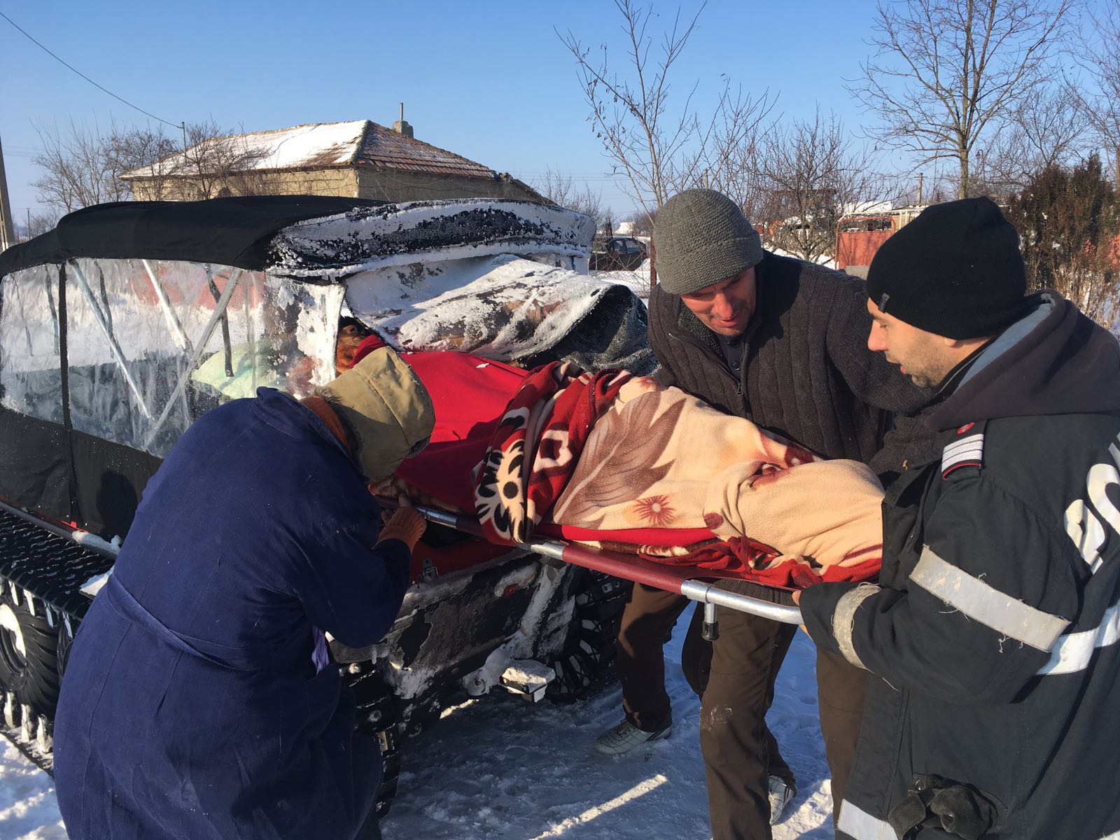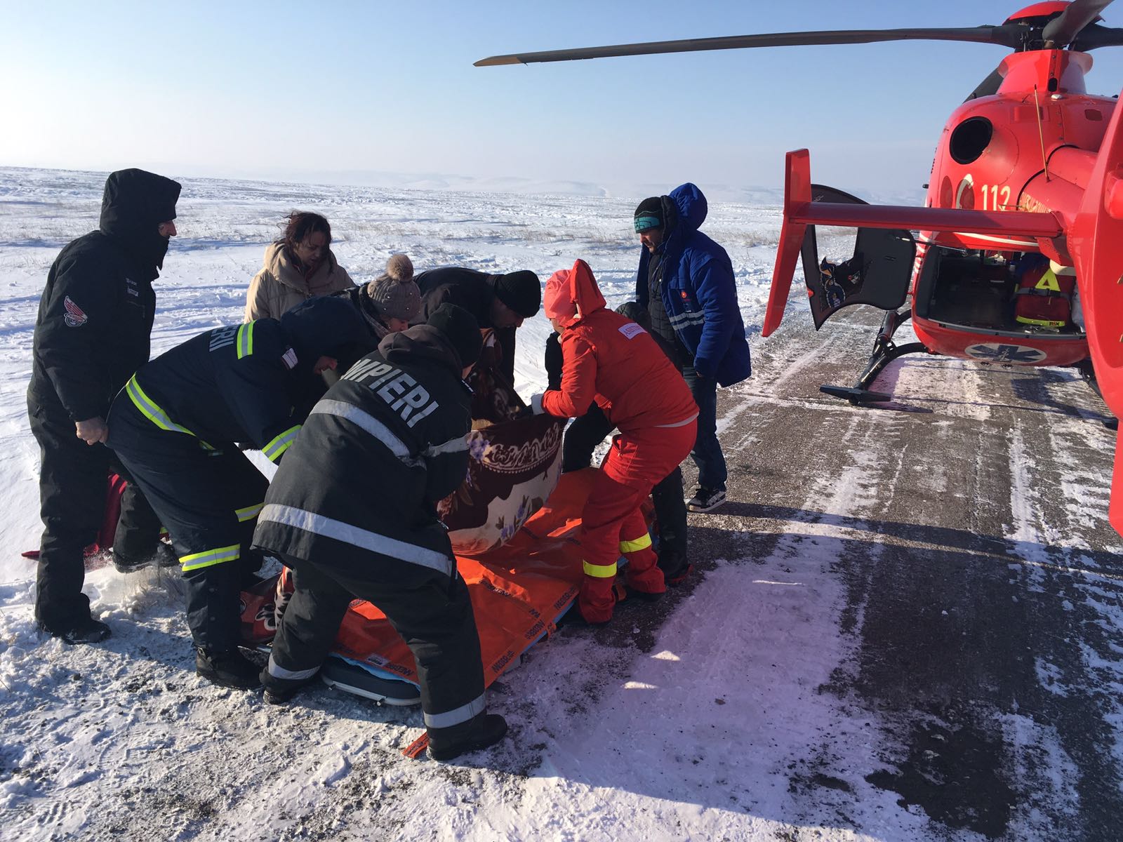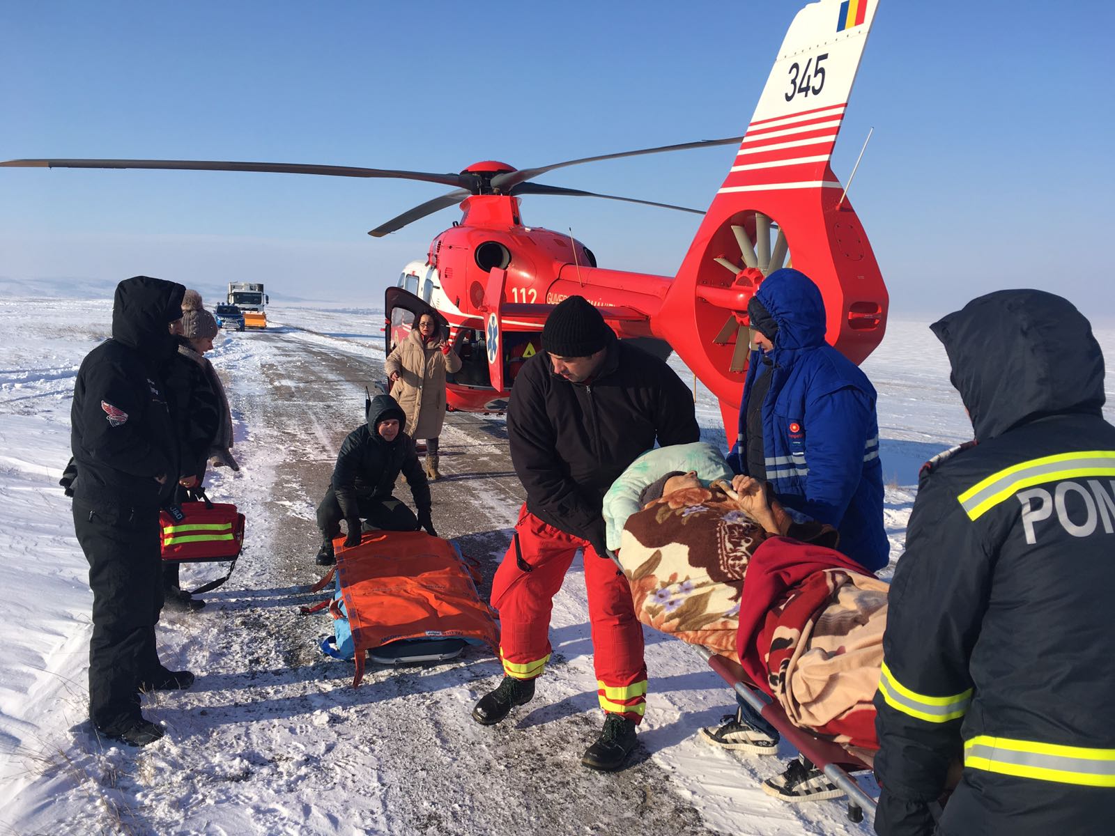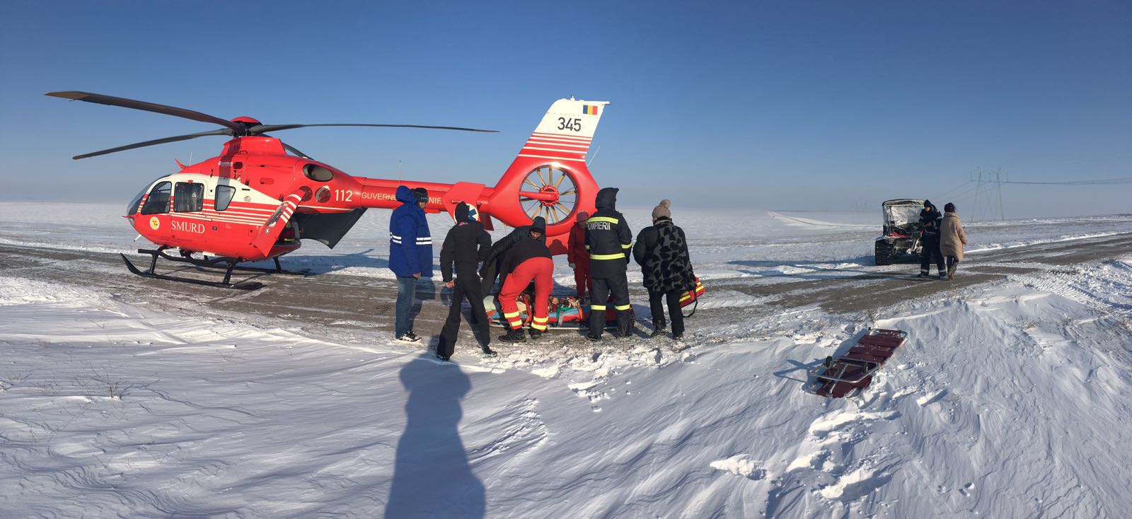 Un bărbat în vârstă de 65 de ani, din Cogealac, care a suferit un accident vascular cerebral a fost preluat de acasă astăzi cu un utilaj cu șenile al ISU Giurgiu și transportat prin zăpadă până la Gura Dobrogei de unde a putut fi preluat de elicopterul SMURD.