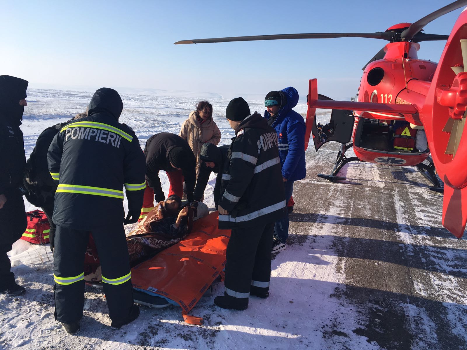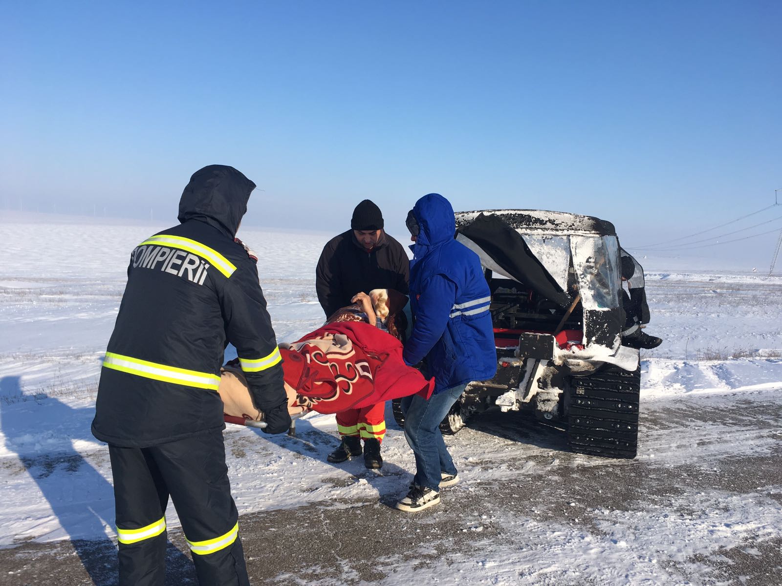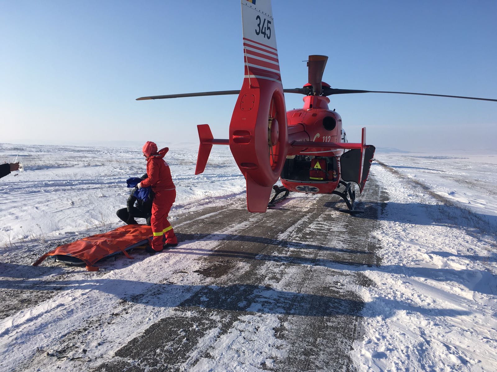 Un bărbat în vârstă de 65 de ani, din Cogealac, care a suferit un accident vascular cerebral a fost preluat de acasă astăzi cu un utilaj cu șenile al ISU Giurgiu și transportat prin zăpadă până la Gura Dobrogei de unde a putut fi preluat de elicopterul SMURD.