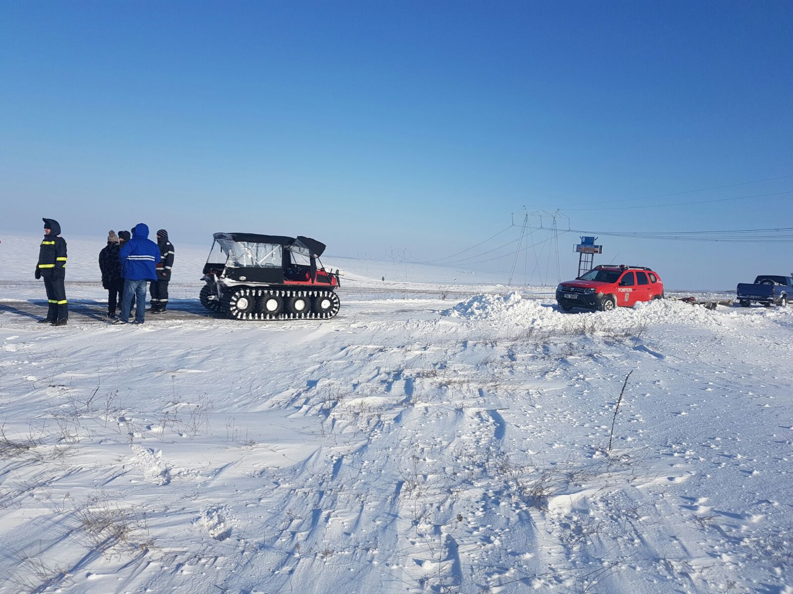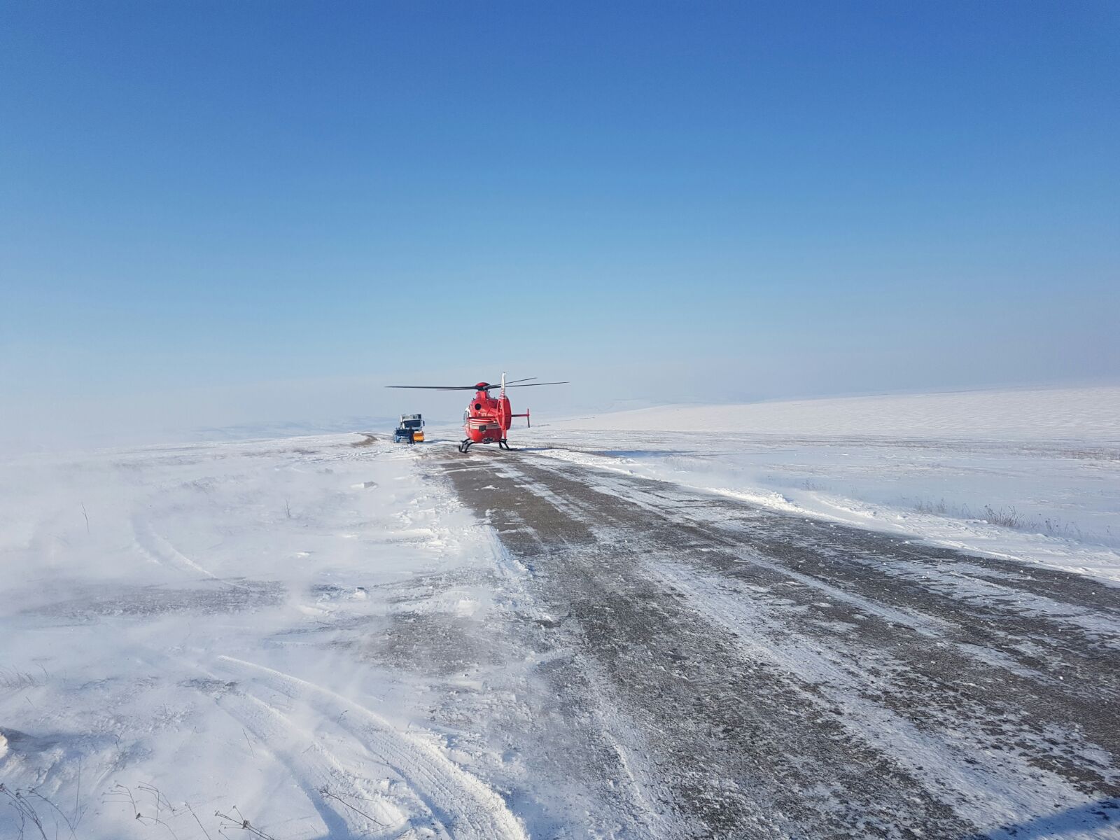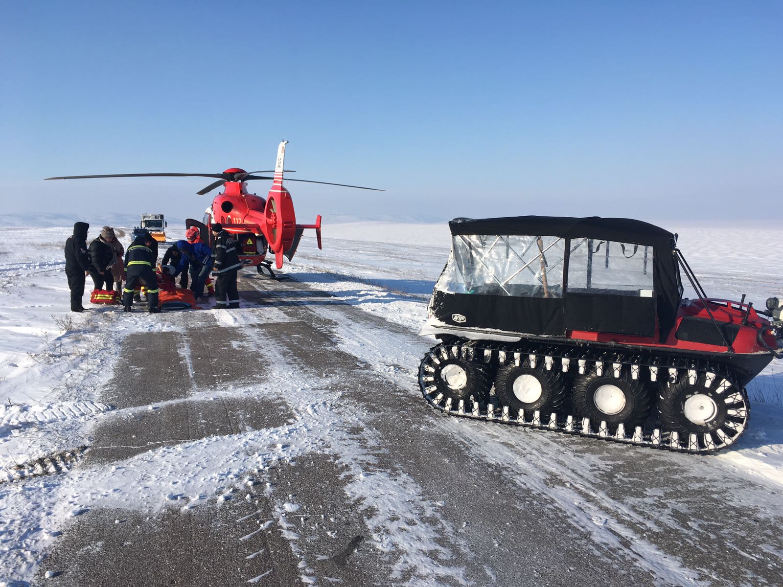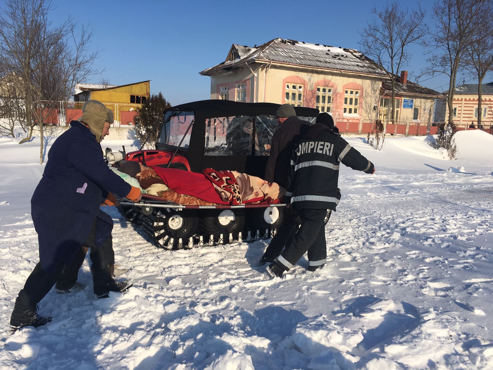 Un bărbat în vârstă de 65 de ani, din Cogealac, care a suferit un accident vascular cerebral a fost preluat de acasă astăzi cu un utilaj cu șenile al ISU Giurgiu și transportat prin zăpadă până la Gura Dobrogei de unde a putut fi preluat de elicopterul SMURD.