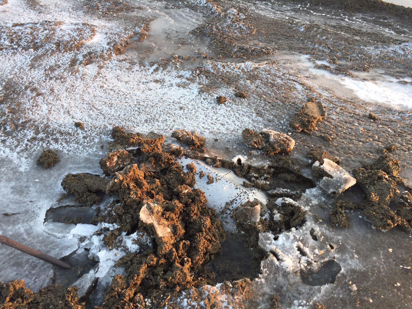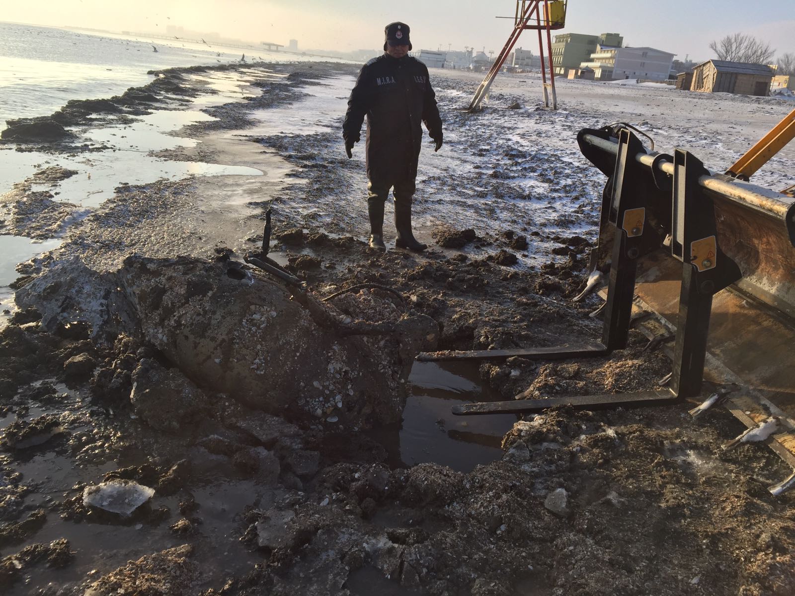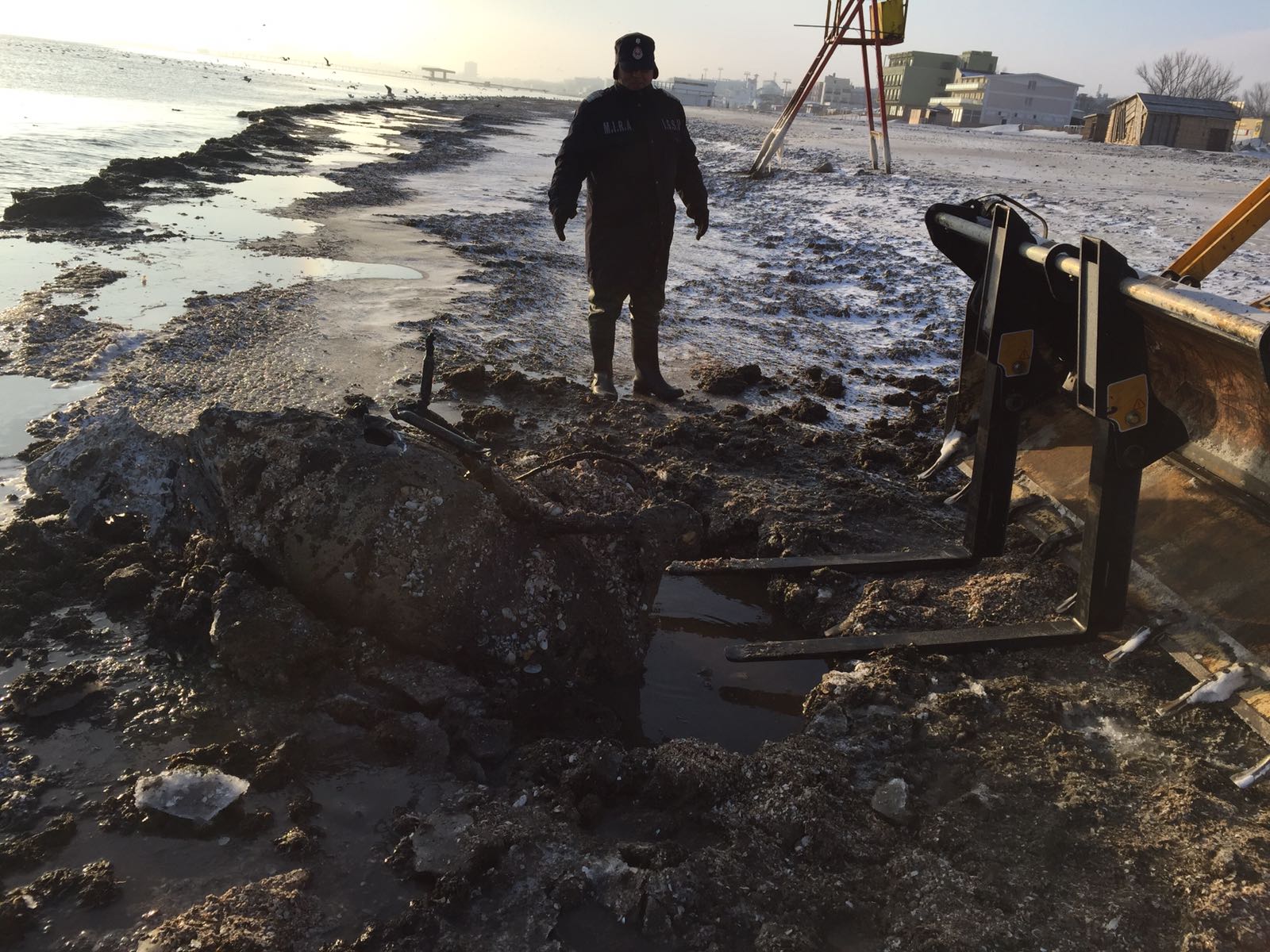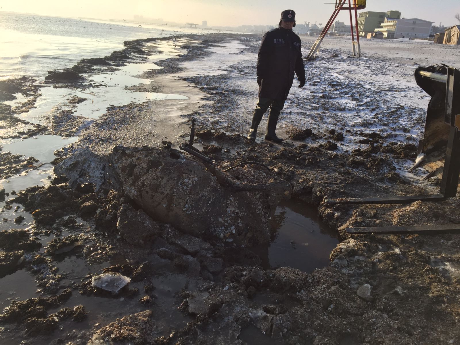 Rezervorul de aeronavă găsit pe plaja din Mamaia a fost scos, în această dimineață, de către pompierii ISU Dobrogea din nisipul înghețat.