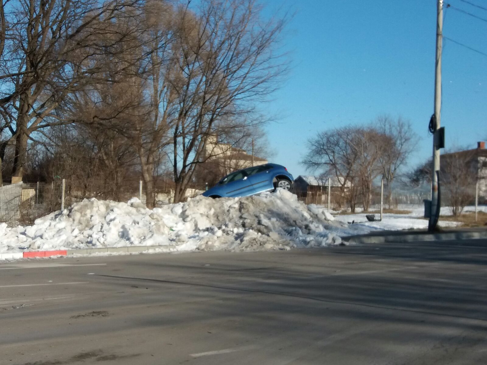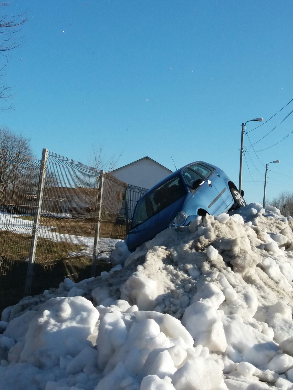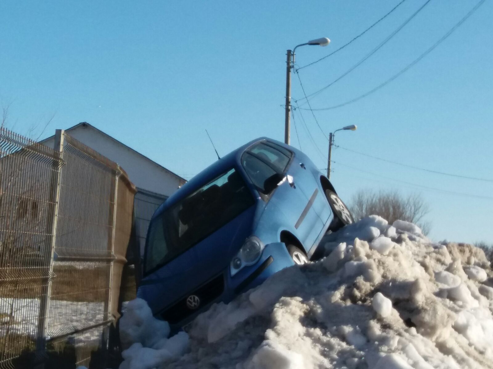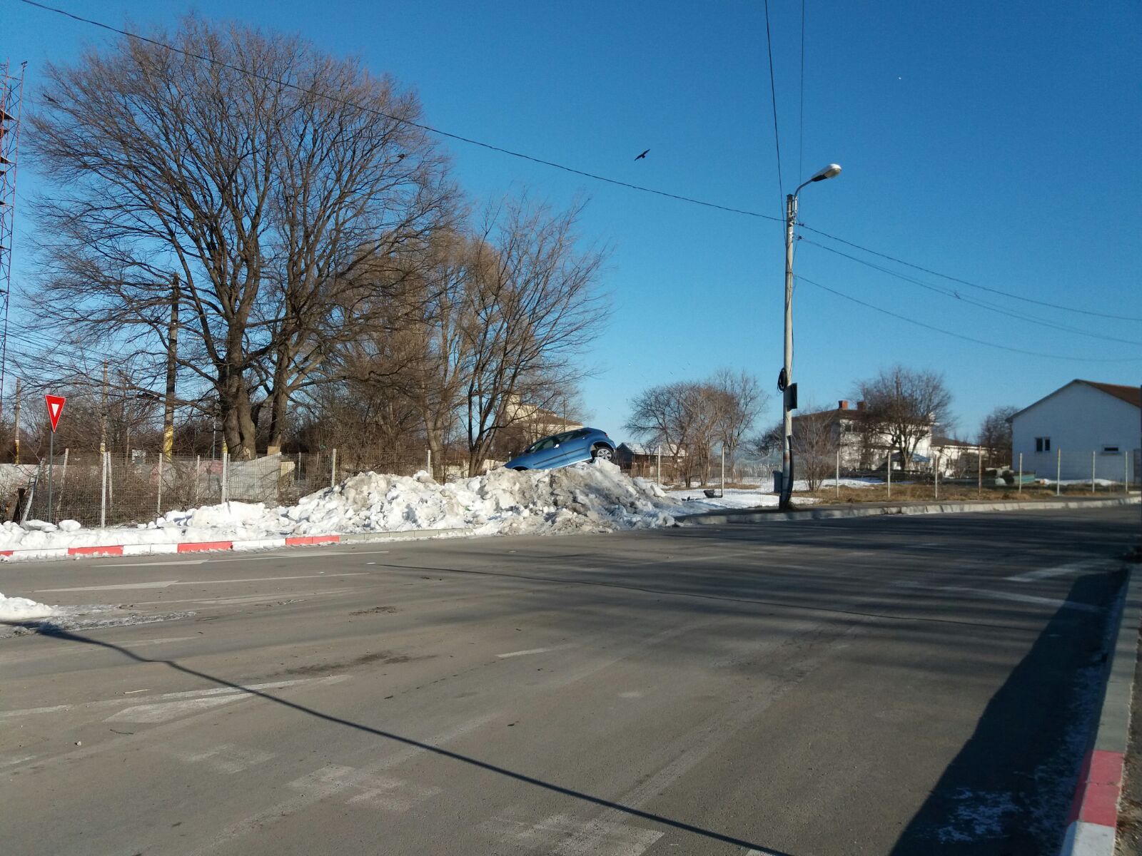 Un șofer din Constanța a reușit o manevră spectaculoasă, ajutat de lipsa de experiență, dar cel mai mult de asfaltul acoperit cu un strat gros de gheață și mormanele de zăpadă de pe marginea străzilor.