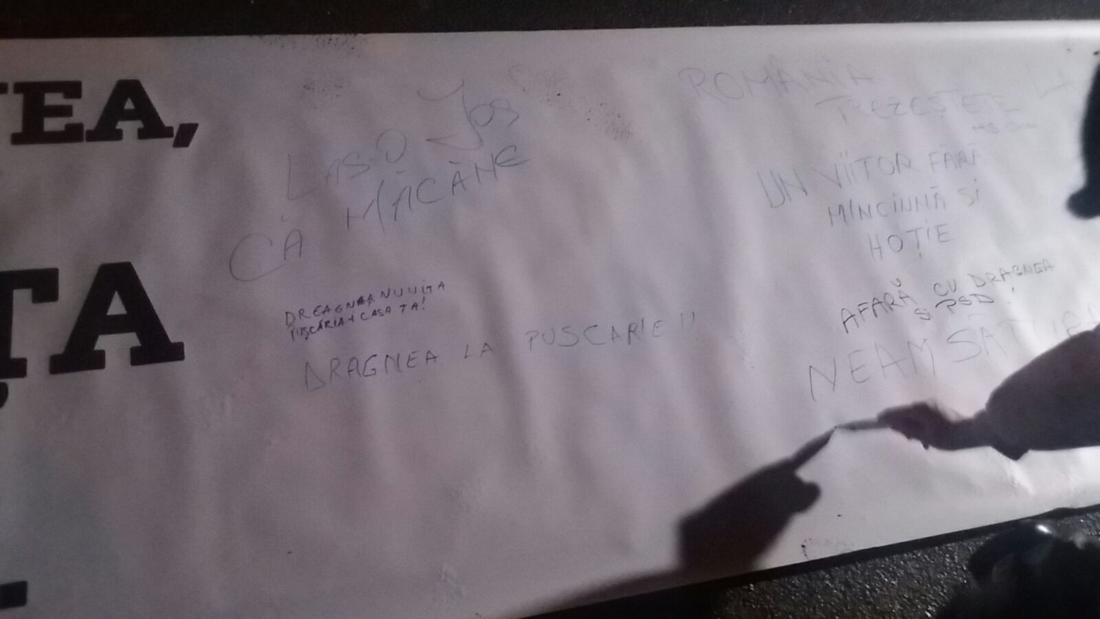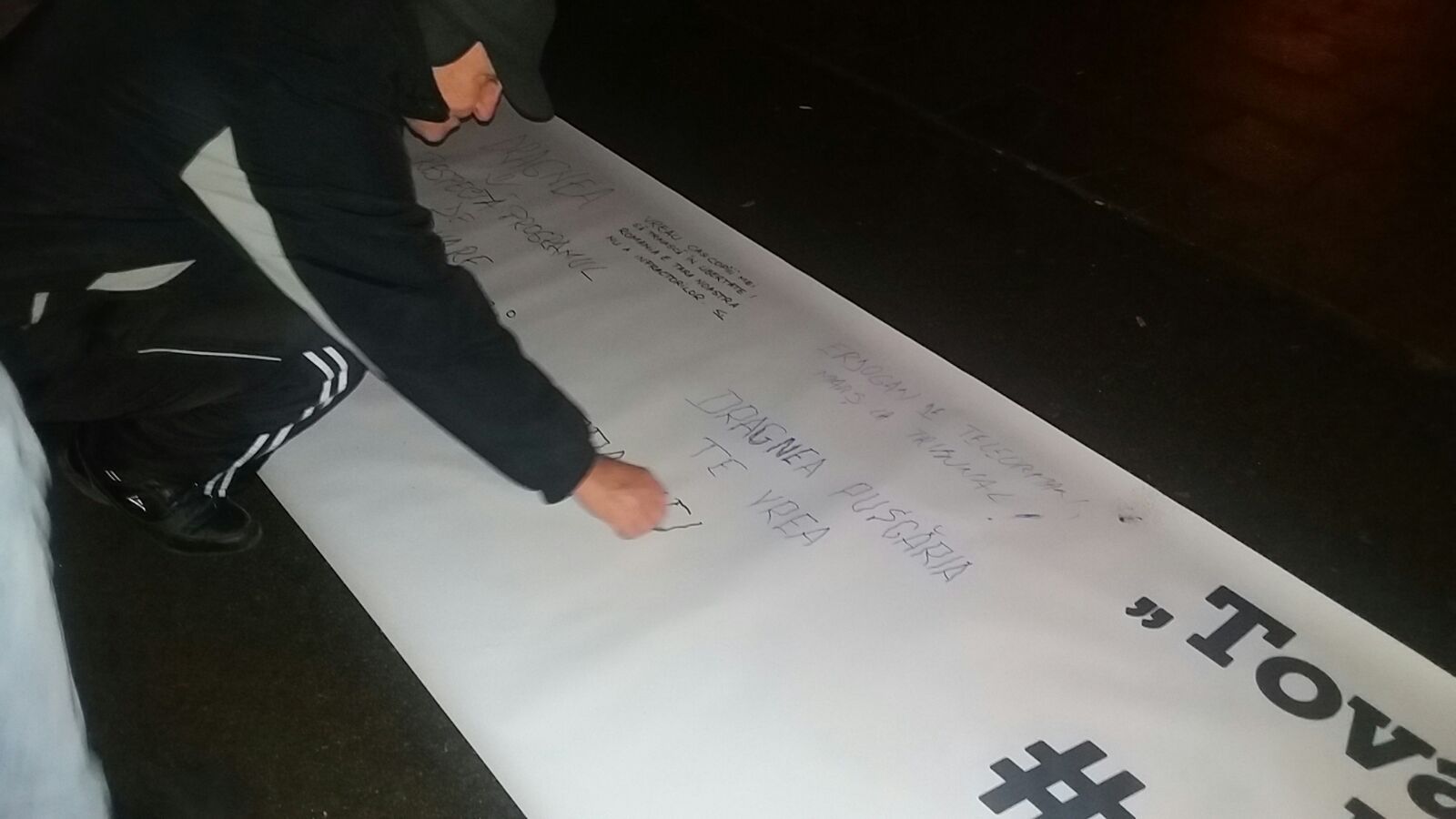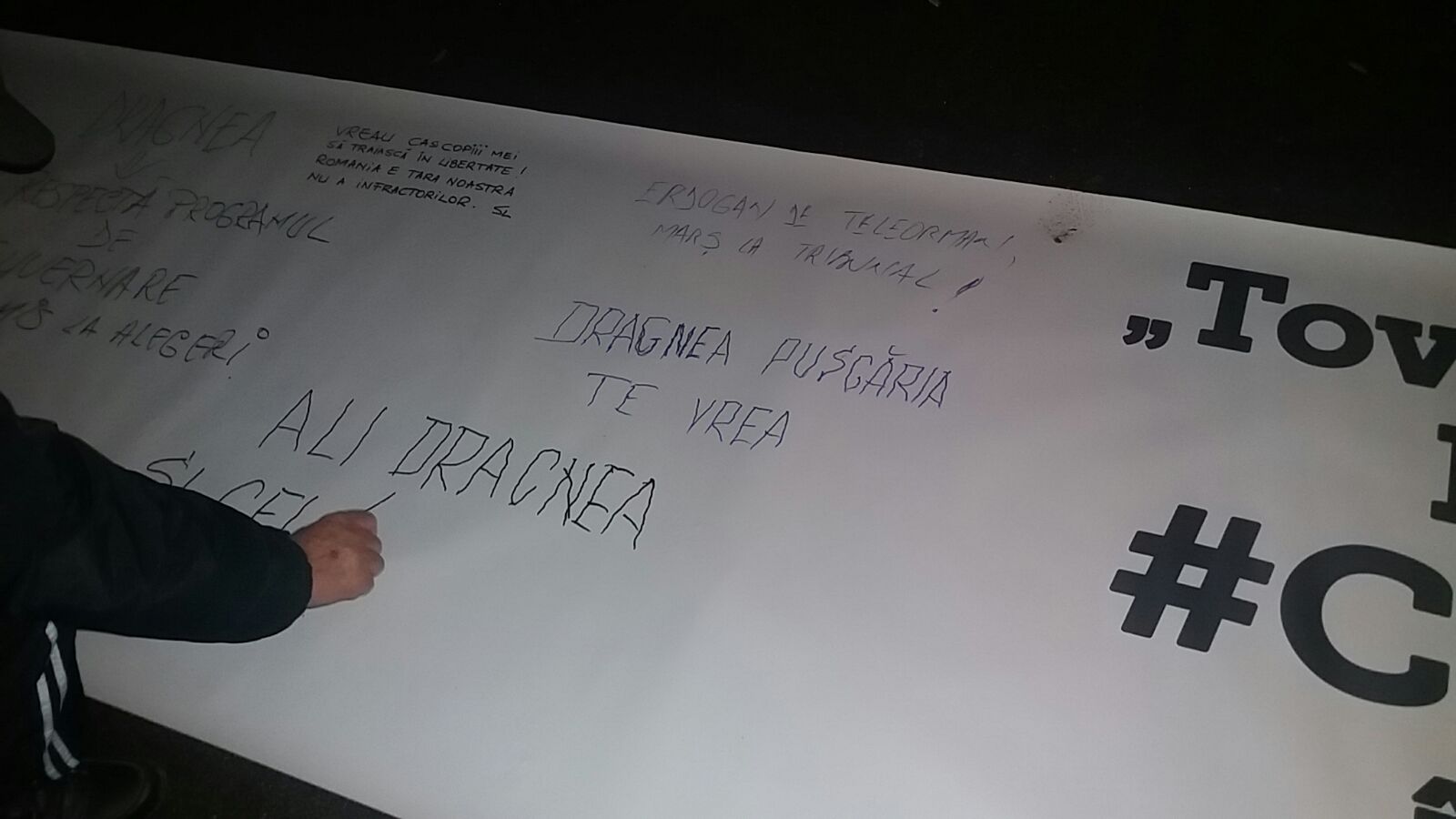 După ce mii de persoane au mărșăluit pe principalele bulevarde din oraș, astăzi, câteva sute de oameni s-au strâns din nou în fața Prefecturii Constanța unde își scriu nemulțumirile pe un banner gigant care măsoară aproximativ 10 metri.