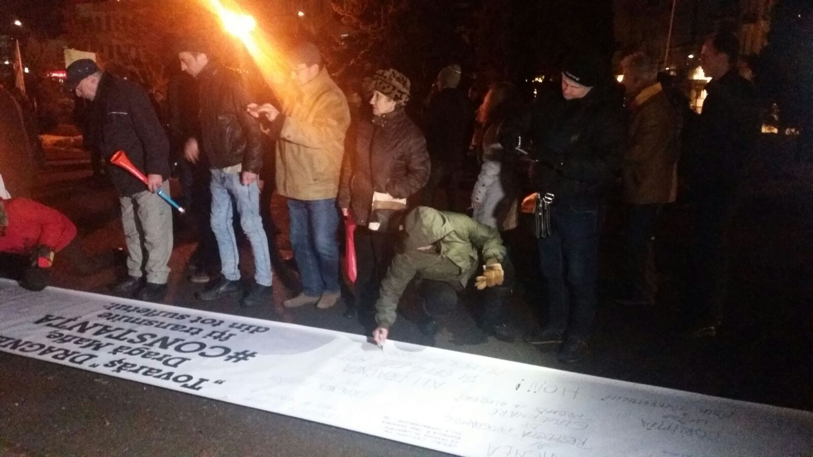 UPDATE. FOTO/VIDEO. PROTEST la Constanța! Manifestanții își scriu nemulțumirile pe un banner gigant
