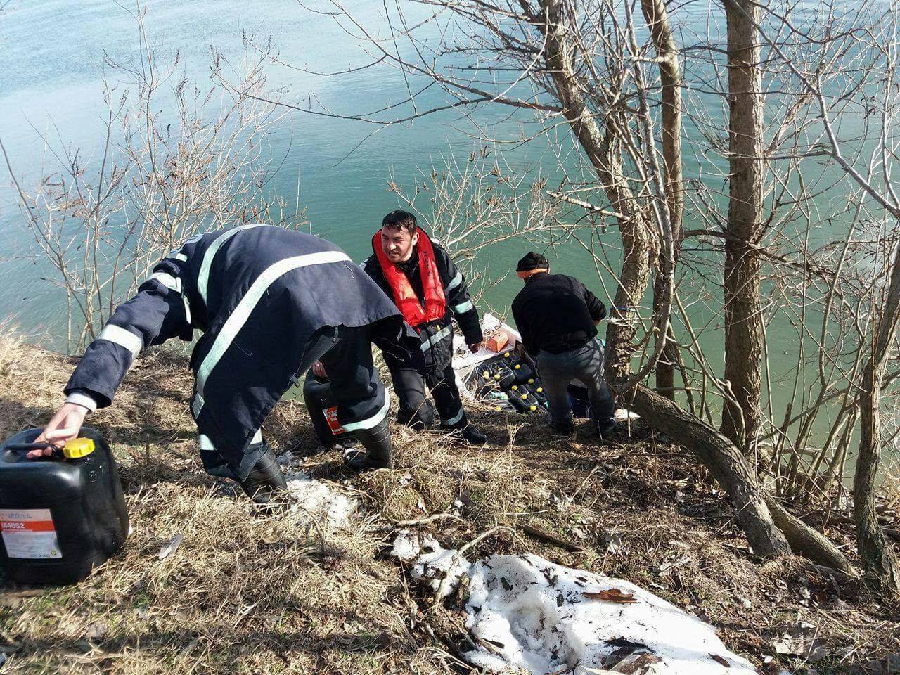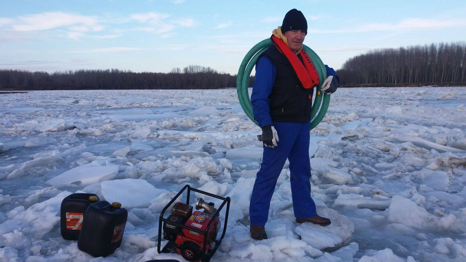 De aici pompierii militari cu sprijinul a trei localnici au descărcat bidoanele de combustibil şi o motopompă şi le-au urcat într-o barcă pe care au împins-o pe gheaţa groasă formată deasupra braţului Borcea.