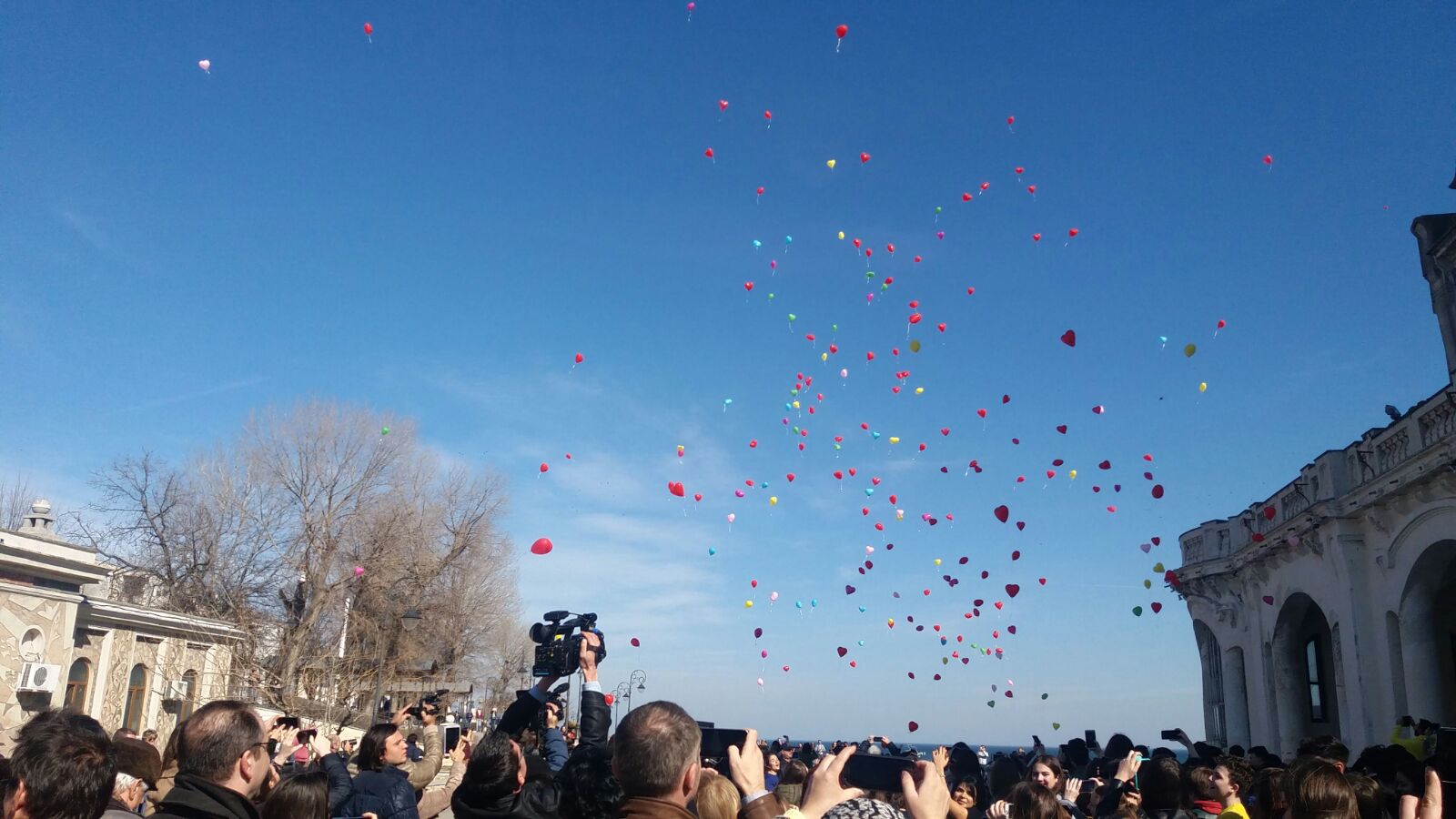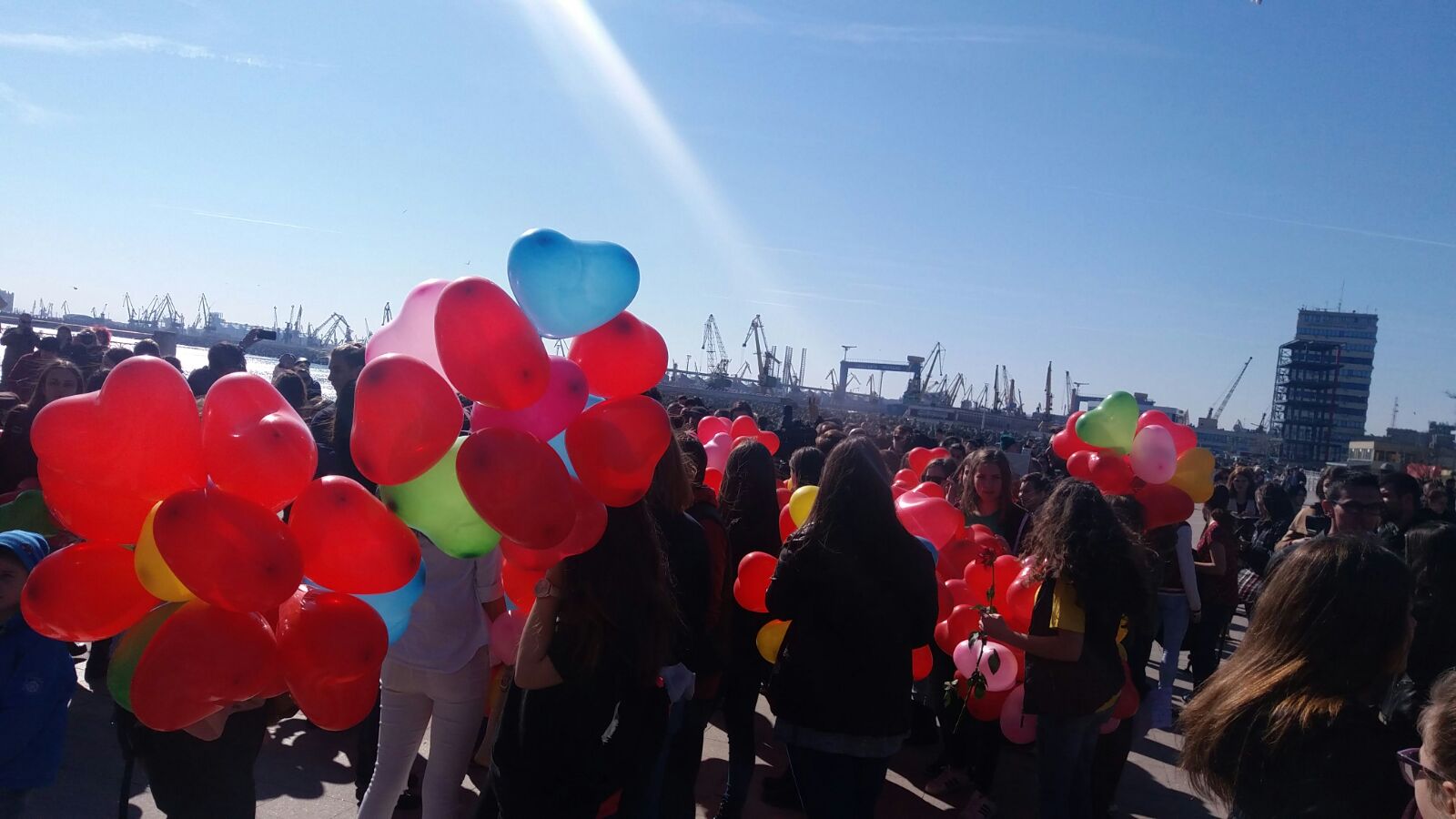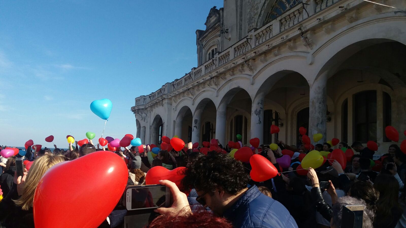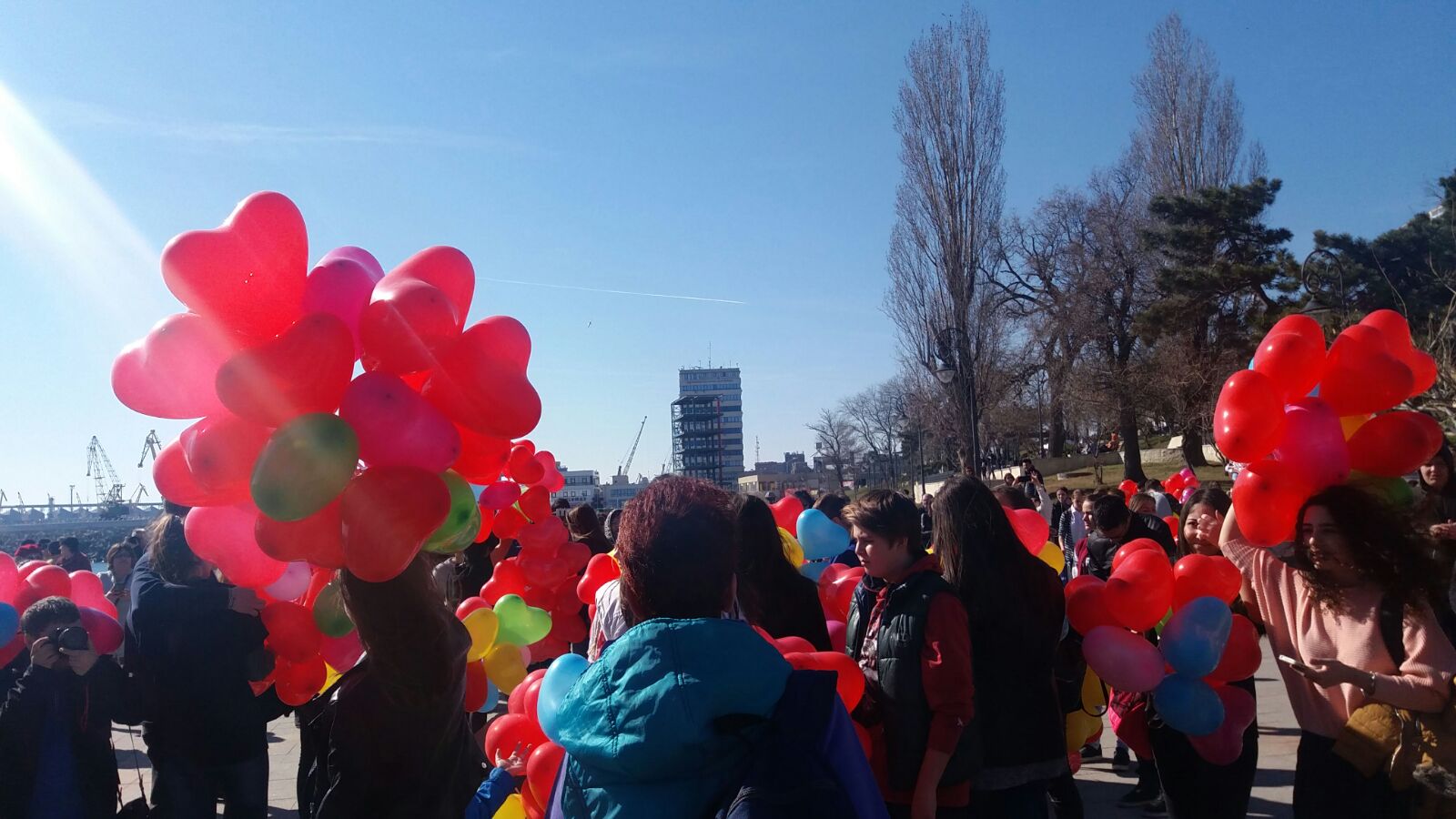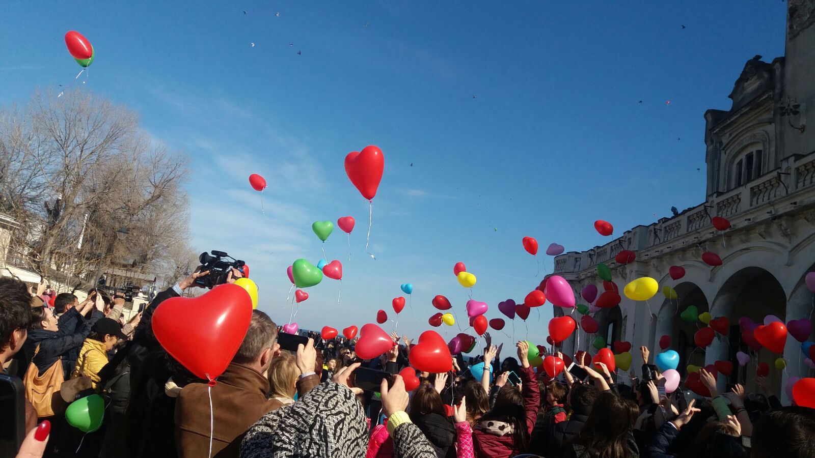 400 de baloane în formă de inimă, umplute cu heliu, au fost lansate de pe faleza Cazinoului din Constanţa.