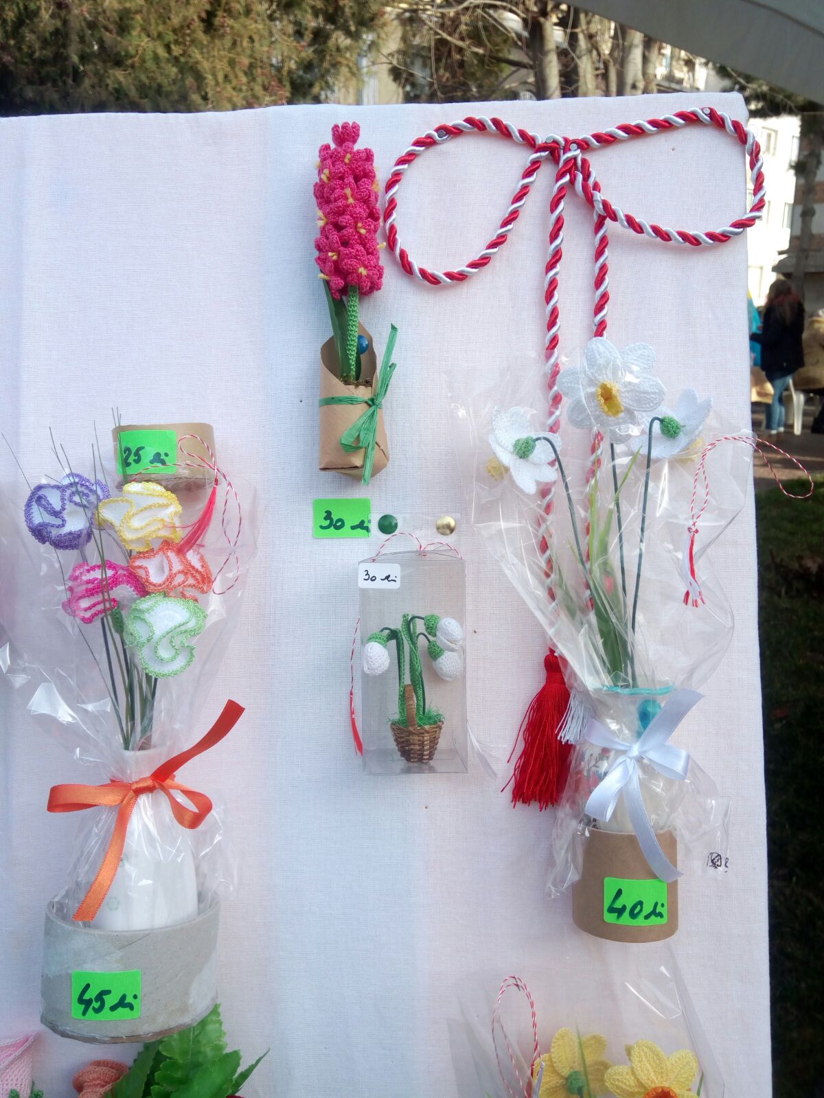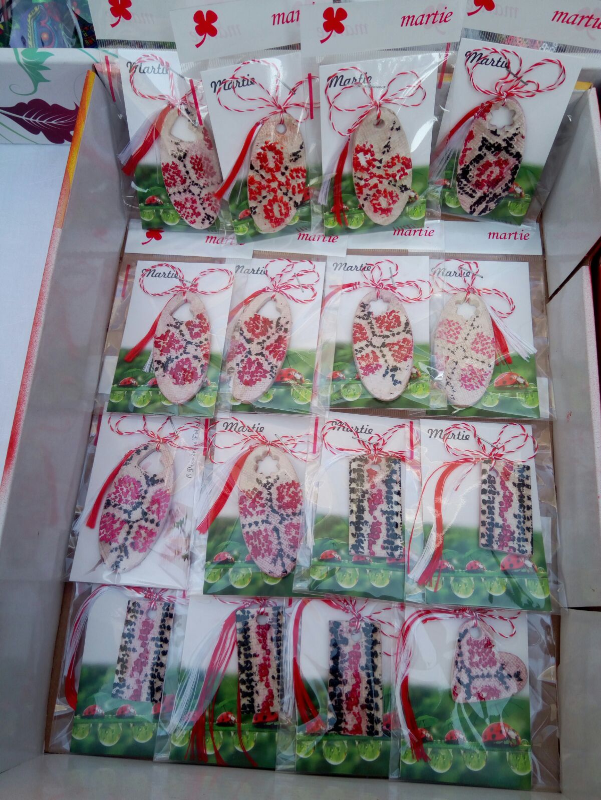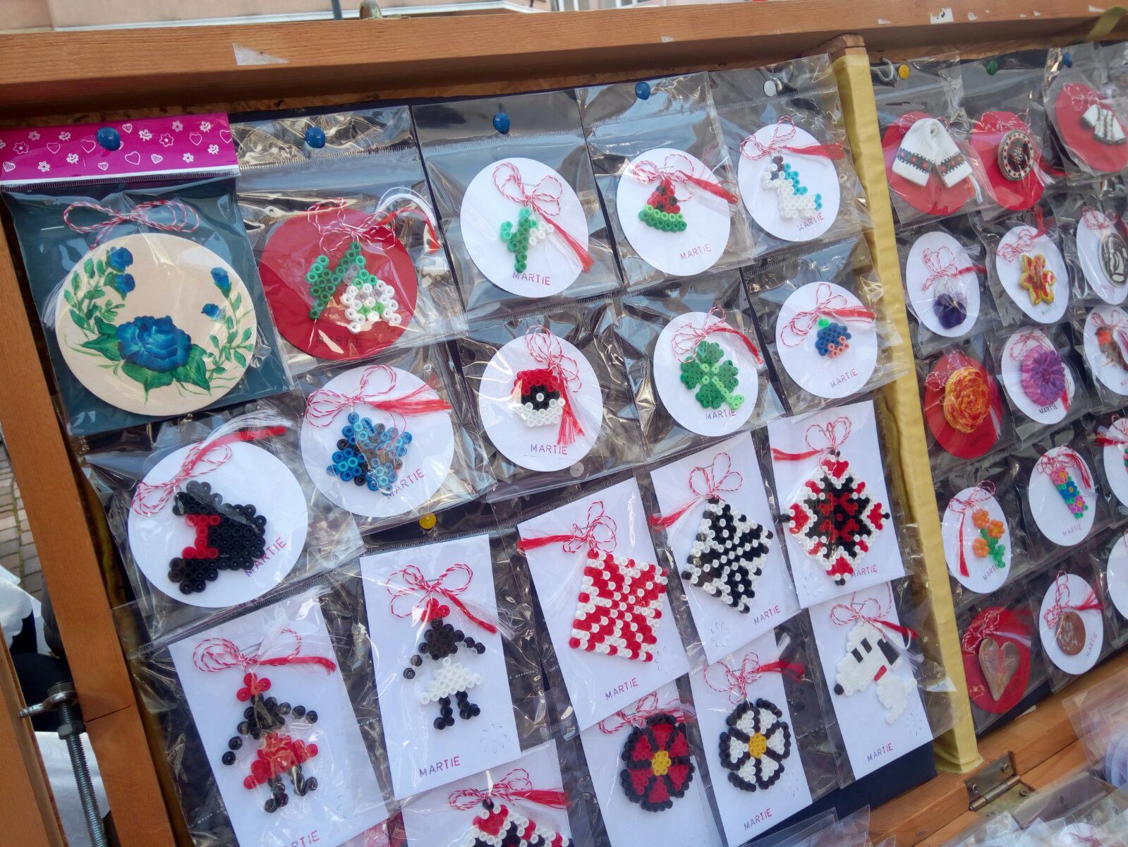 Vedetele târgului sunt mărţişoarele în formă de cămaşă tradiţională românească, pictate pe lemn.