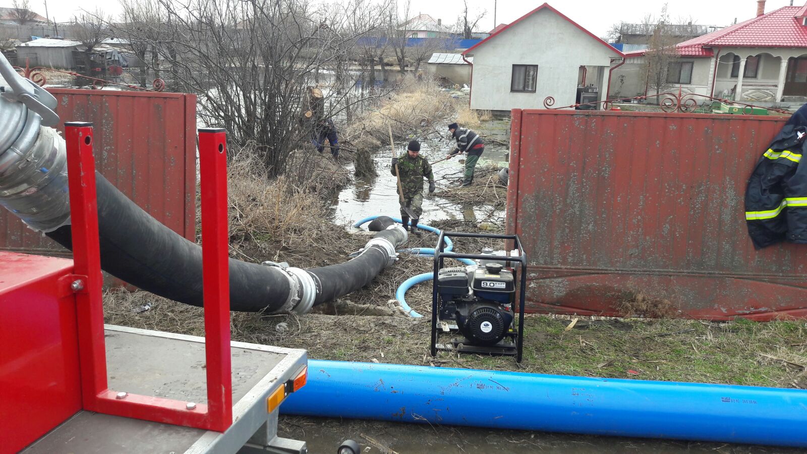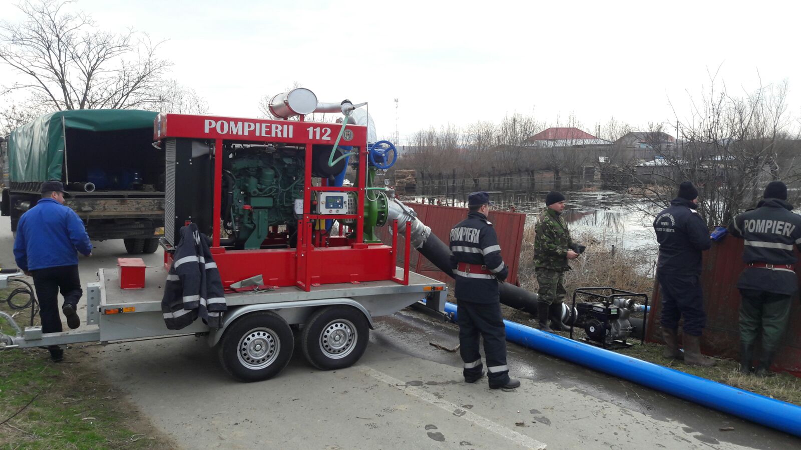 Pompierii ISU Delta Tulcea din cadrul Sectiei Măcin intervin cu o motopompă pentru evacuarea apei din grădina unei gospodarii din localitatea Grindu.