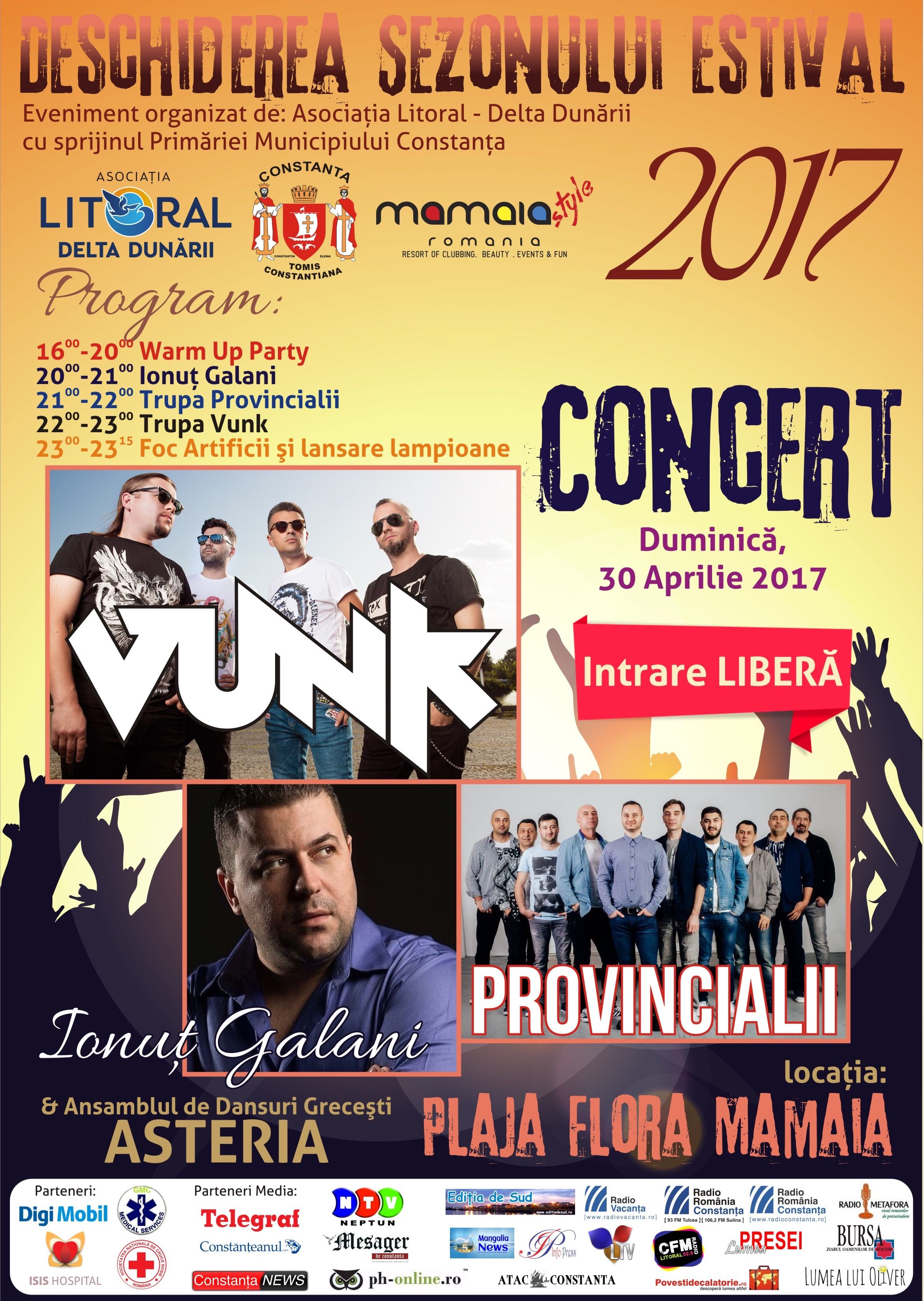 – 16.00 – 24.00 – Mega Concert pe Plaja Hotel Flora Mamaia cu trupele Provincialii, Vunk şi îndrăgitul Ionuţ Galani. Lansăm împreună un Show de artificii şi mii de lampioane între Mamaia, Delta Dunării şi Vama Veche, alături de turiştii noştri şi de ministrul Turismului, Mircea Titus Dobre, invitatul nostru.
