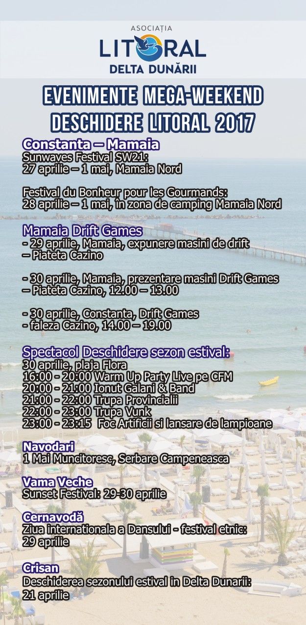 Reprezentanții Asociației Litoral Delta Dunării au prezentat, miercuri după-amiază, în cadrul unei conferințe de presă, principalele evenimente pe care le vor organiza pe litoral şi în Delta Dunării cu ocazia deschiderii sezonului estival, în preajma minivacanţei de 1 Mai.